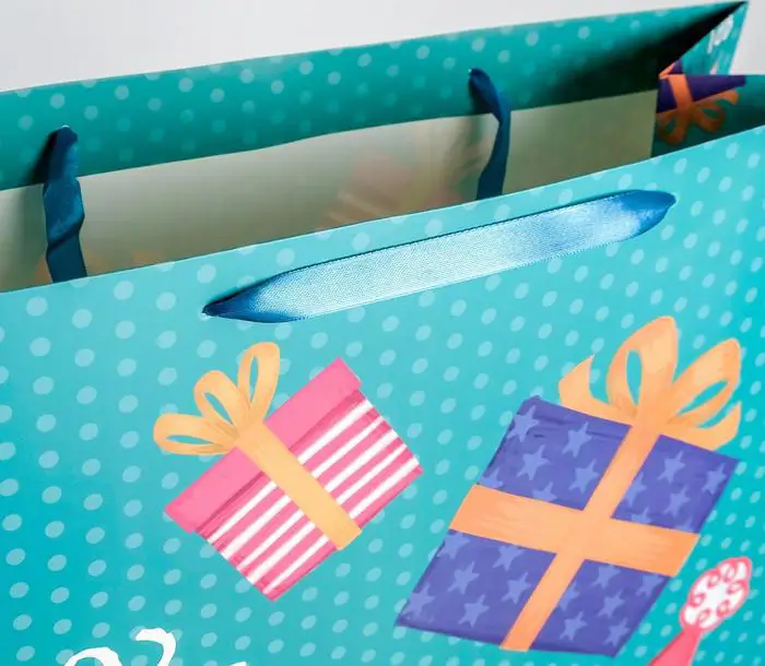 Подарочный красочный пакет используется для упаковки сувениров, одежды. Картон обладает значительной прочностью и небольшой толщиной, имеет изображение на лицевой стороне.
