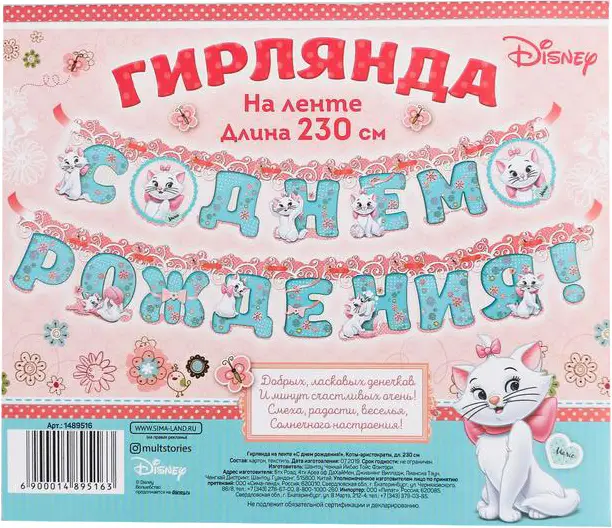 Гирлянда на ленте Страна Карнавалия С Днем Рождения! Коты аристократы, 230 см