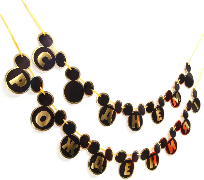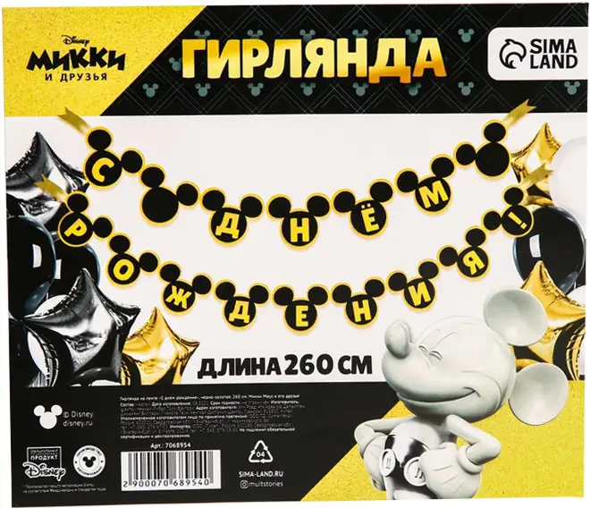 Гирлянда на ленте Страна Карнавалия С Днем Рождения Микки Маус и его друзья, черно-золотая, 260 см