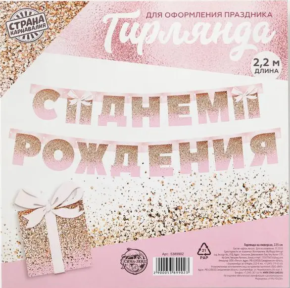 Гирлянда на люверсах Страна Карнавалия С Днем Рождения розовая с подарком, 225 см