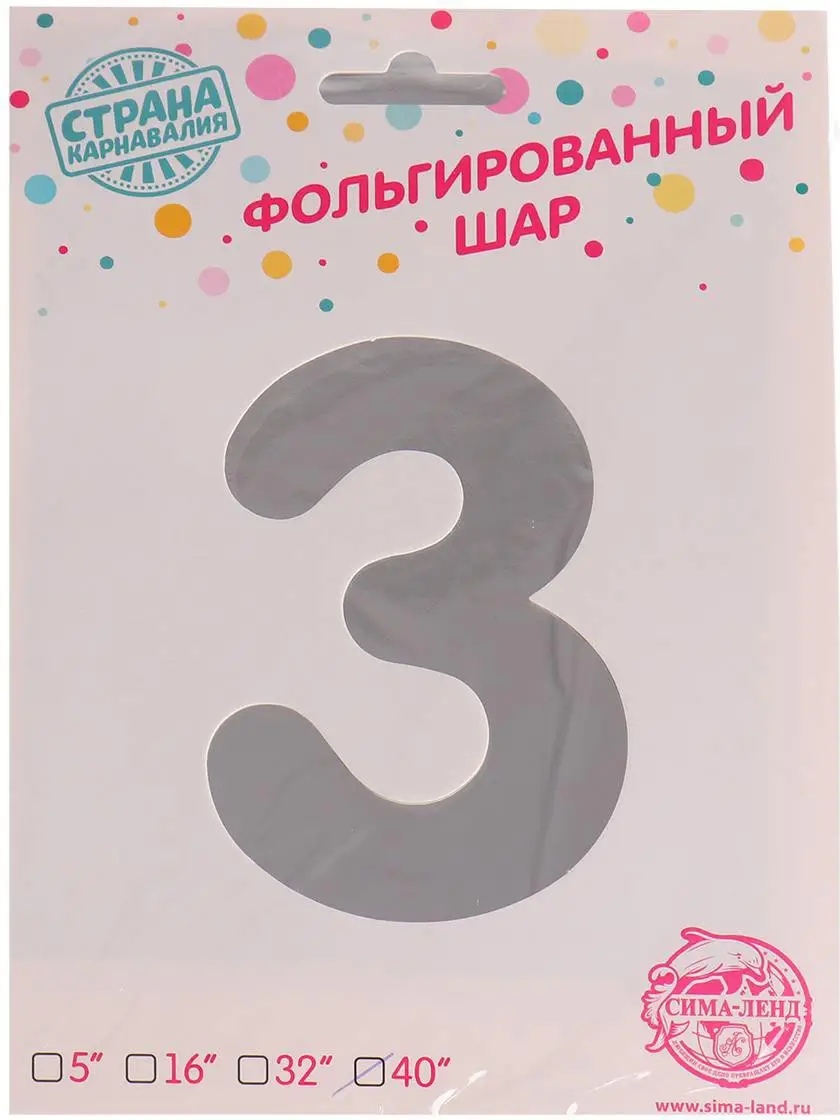 Шар Страна Карнавалия фольгированный цифра 3, серебряный, 40"