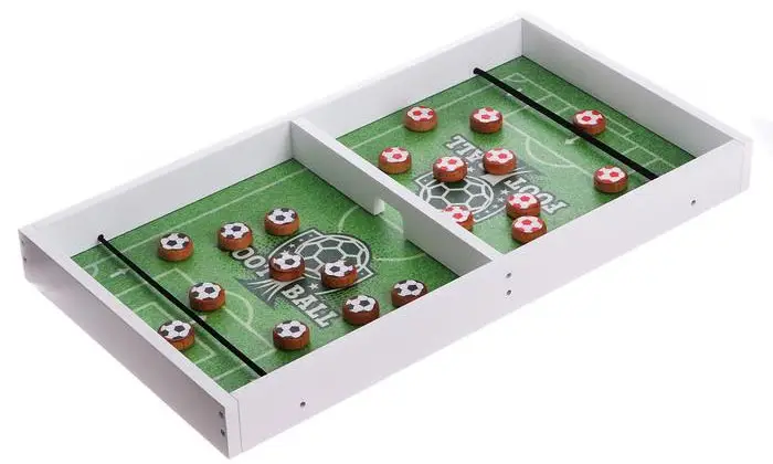 Играть в настольную игру Футбол очень просто, но невероятно увлекательно. Выиграет самый быстрый, меткий, ловкий и находчивый. Настольная игра представляет собой яркое тематическое игровое поле с бортами, разделённое планкой с воротами на 2 зоны. Игроки должны забрасывать шайбы на поле соперника. В арсенале каждого – 10 шайб. Задача заключается в том, чтобы быстрее соперника забросить все свои шайбы на его поле.