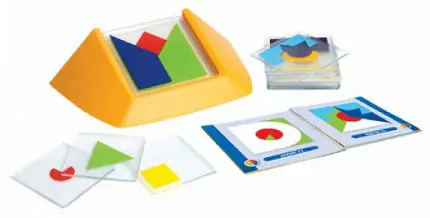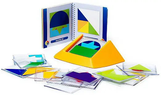 В комплекте: буклет с заданиями, 18 прозрачных плиток с цветными фигурками, подставка.