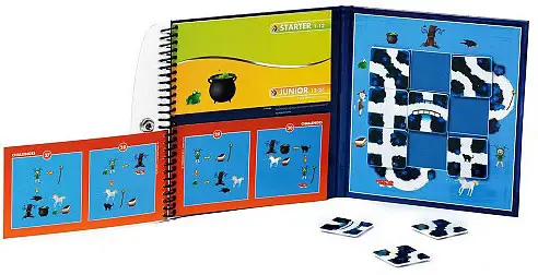 Игра выглядит в форме книги с магнитными карточками и заданиями.
