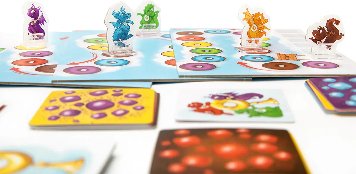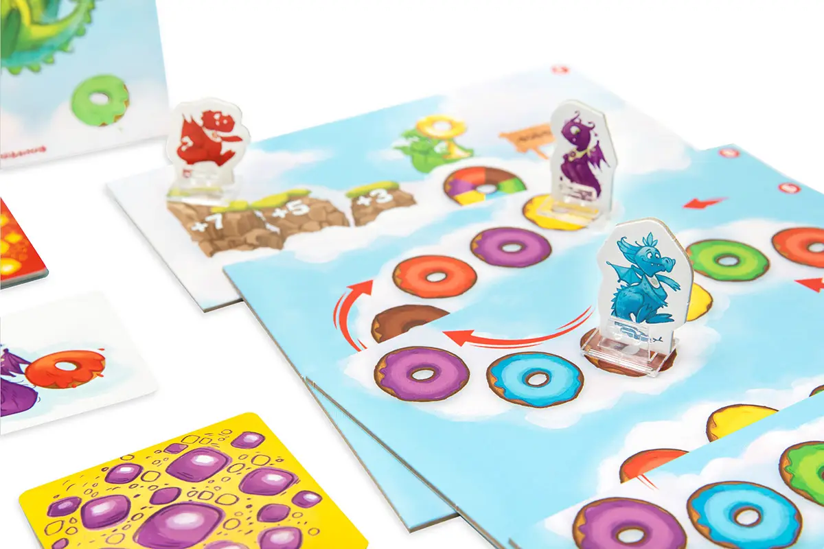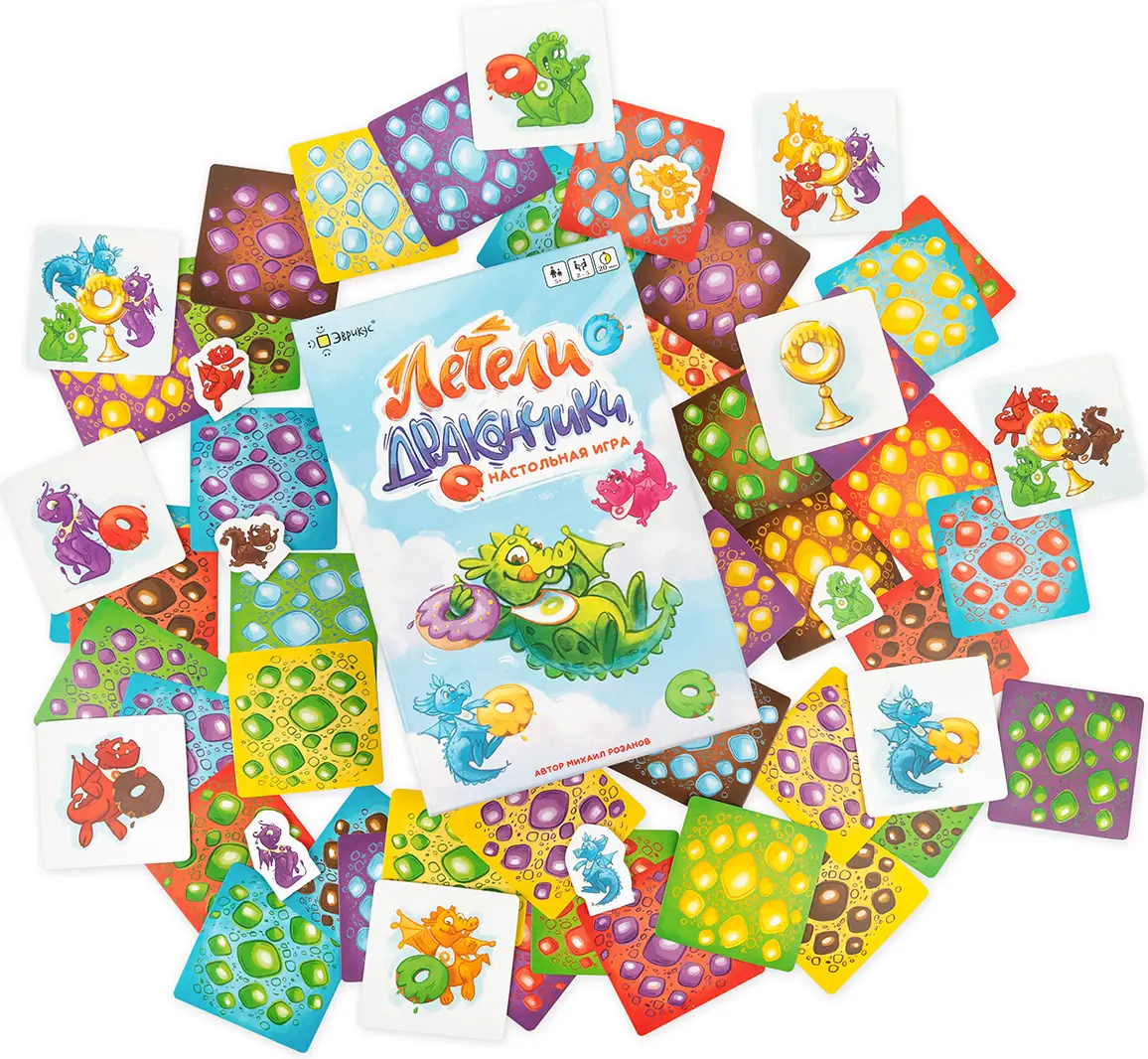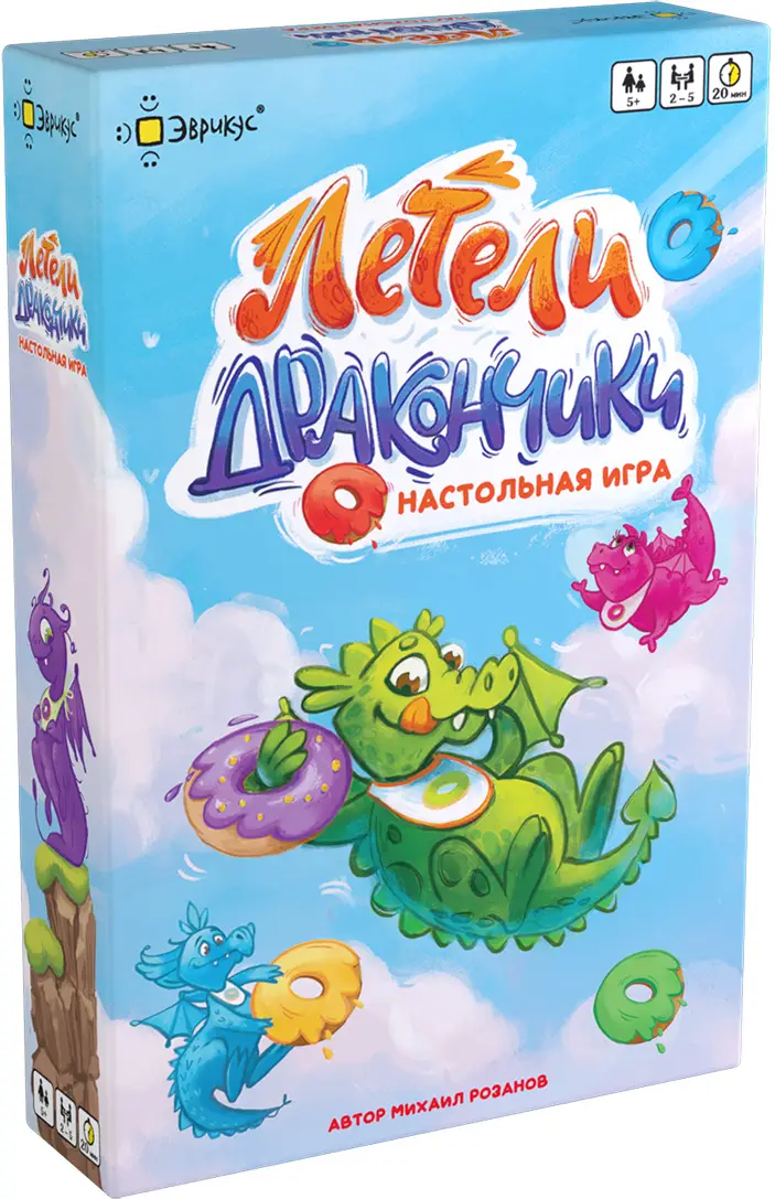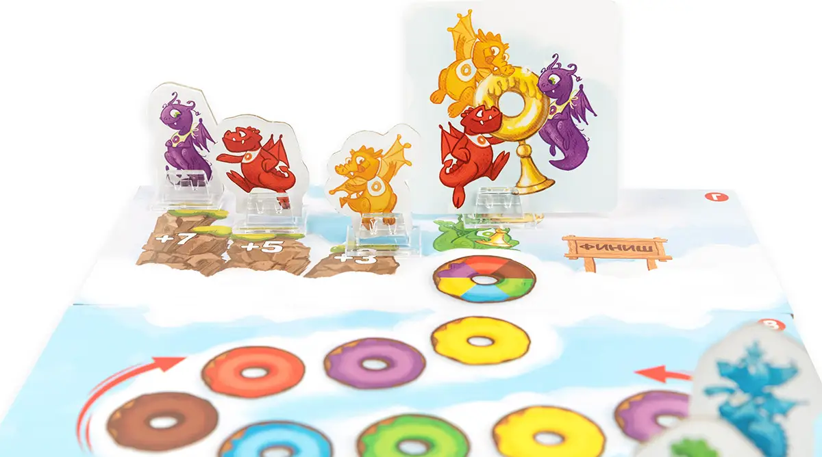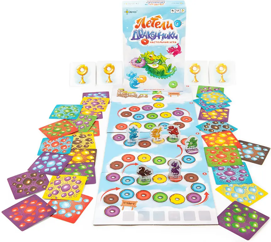 Летели дракончики – семейная игра-гонка, где вам предстоит привести к финишу несколько дракончиков по вашей карточке-заданию. Замедляйте или ускоряйте летающих дракончиков, подкармливая их любимыми лакомствами. Но чем больше пончиков слопает дракончик, тем сильнее замедлится его полёт.
