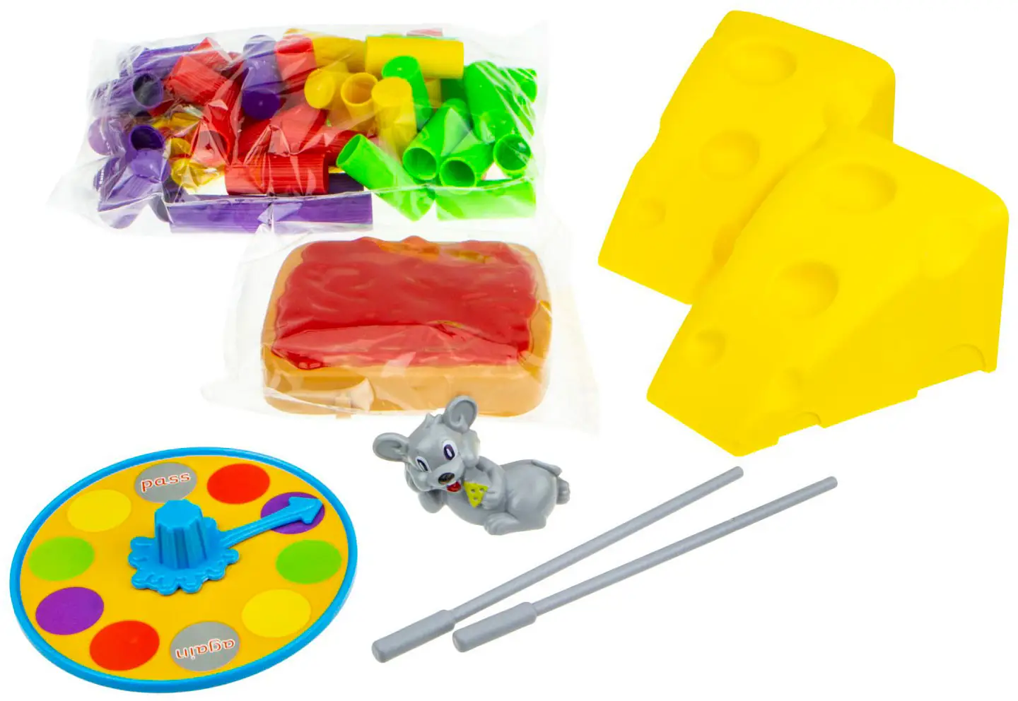 Настольная игра представлена прямоугольной платформой стилизованной под сэндвич, 2 муляжами в виде аппетитных кусочков «дырявчатого» сыра, разноцветными бревнышками, прутами и рулеткой. Задача ребёнка – выстроить конструкцию из разноцветных брёвен и, усадив на её вершину фигурку мышонка, выбивать прутиком одно бревно за другим, стараясь не тревожить сердитого мышонка.