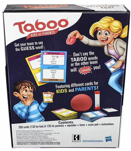 Правила для этой версии упрощены, чтобы дети тоже могли поучаствовать, однако это ничуть не умаляет крутости игры Табу. Игроки делятся на команды (минимум по двое). Карточки подготавливаются и засекается время, как только начинается раунд. Когда команда делает ход, противники должны внимательно следить за объяснением, чтобы игроки не произносили при объяснении стоп-слова. Они указаны внизу под загадываемым термином. При этом условия у команд равны: у детей всего 2 запретных слова, а у родителей – 4.
