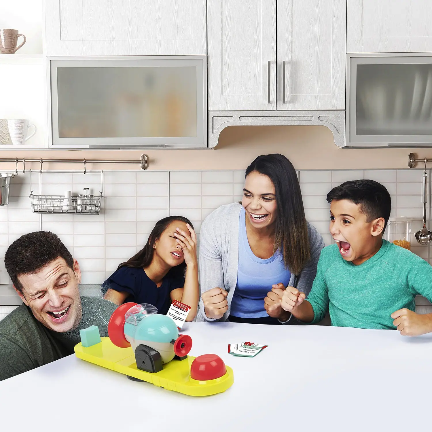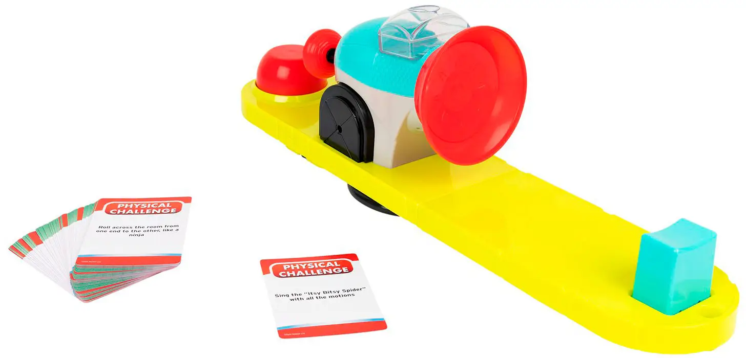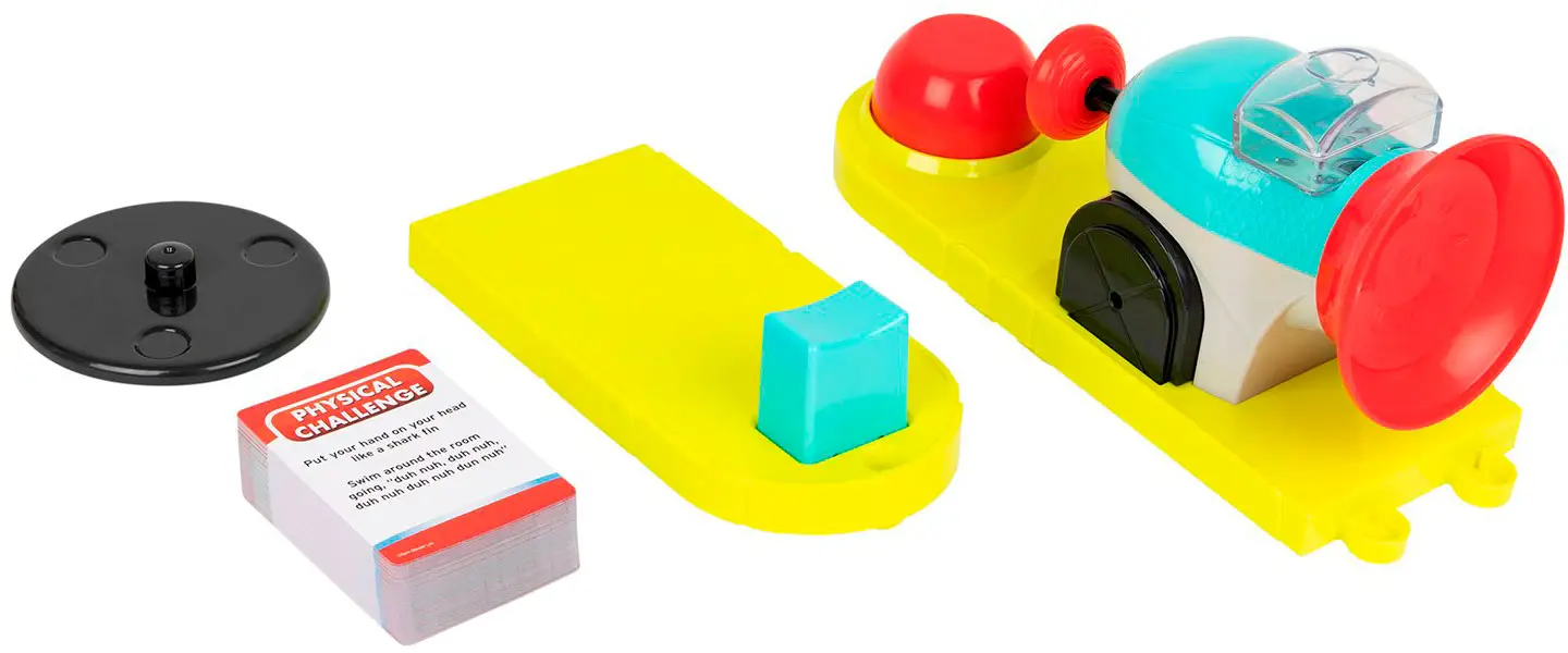 Настольная игра на время, в которой нужно успеть выполнить задание за 30 секунд, или игрок будет обрызган струей воды в лицо. Установите двухкомпонентную водяную пушку на вращающуюся основу, расположите подбородок на специальной подставке. Когда время ответа закончится, вода обрызгает игрока.