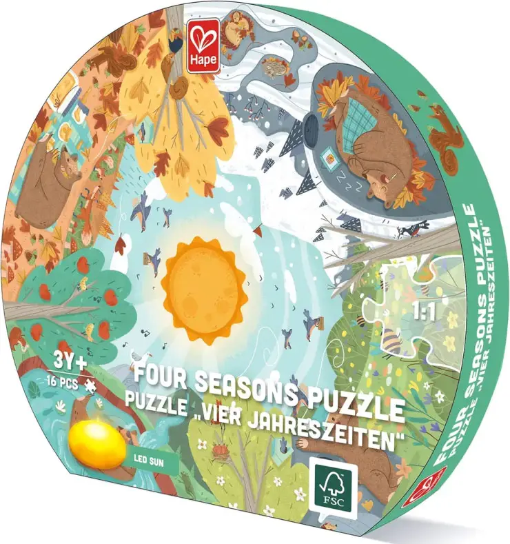 Пазл с изображением четырёх времён года разделён на элементы, которые нужно собрать в целую картинку. Товар оснащён светодиодным солнцем и двусторонним плакатом в масштабе 1:1 с иллюстрациями – головоломками и дополнительными забавными фактами о четырёх временах года. Пазлы тренируют мелкую моторику рук, развивают внимание и усидчивость.