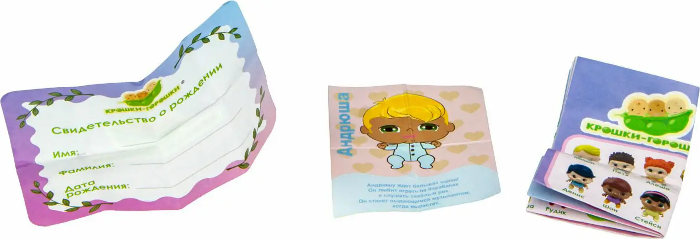 - в комплекте с куколкой находится коллекционный буклет, карточка персонажа и свидетельство о рождении, в которое ребенок сможет вписать имя, фамилию и дату рождения своего пупса;