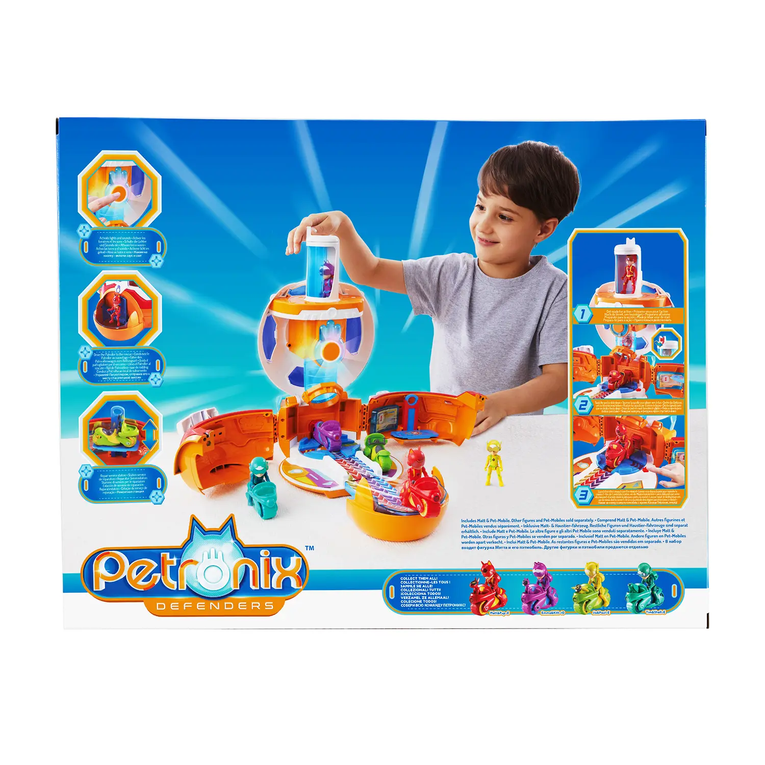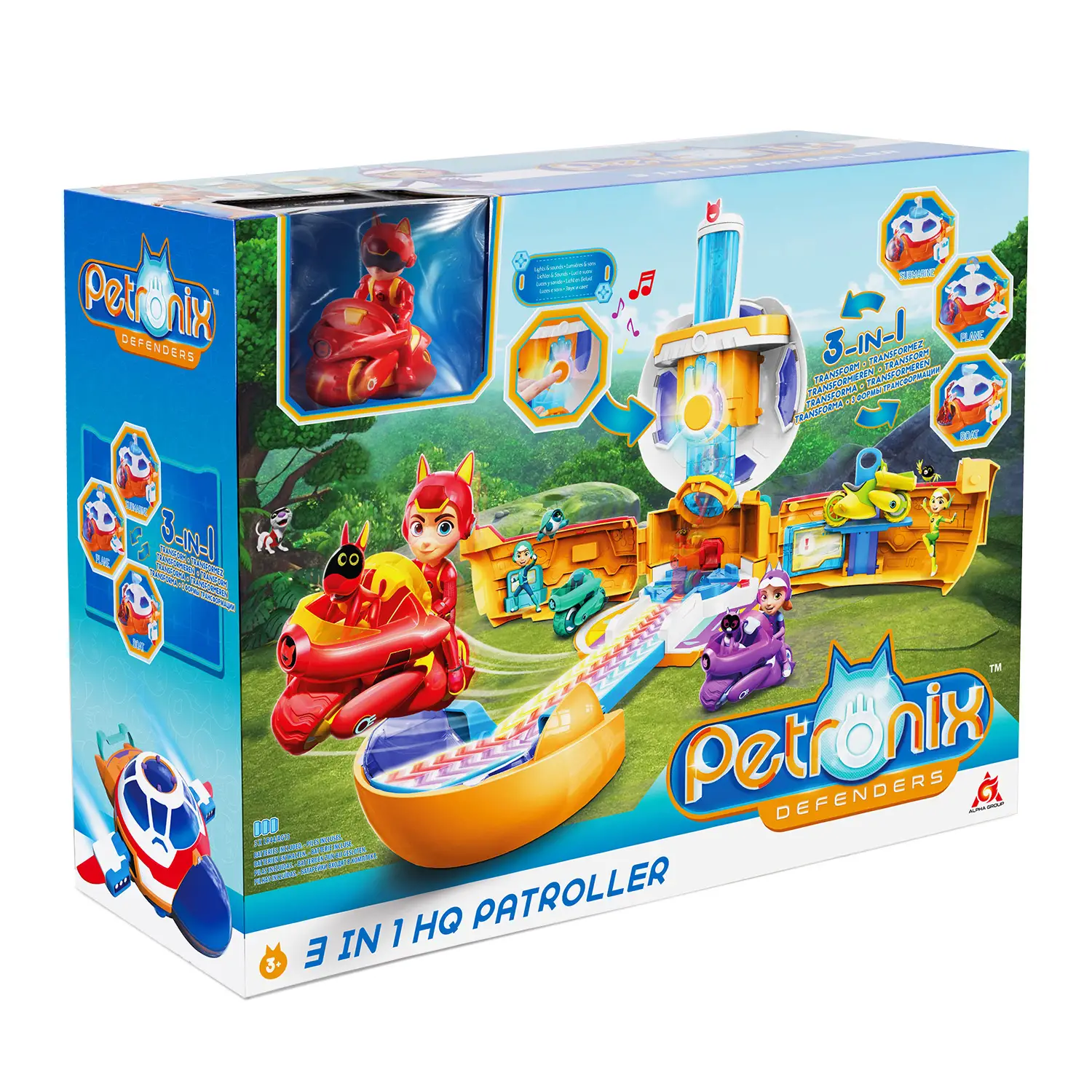 Животное в опасности? Команда Петроникс, вперед! К Патроллеру! Петроникс Патроллер – отправная точка для всех миссий! Игровой набор 3-в-1 трансформируется в самолет, субмарину и лодку! В раскрытом виде - это штаб-квартира команды Петроникс с декоративным компьютерным экраном и подвижным мотоциклетным подъемником. Установи специальную кабину на верхней платформе, что собрать пусковую установку. Поставь пэтмобиль на подиум, помести в кабину фигурку Мэтта и поверни корпус на 180 градусов – герой быстро окажется на пэтмобиле! Нажми на стрелочку и запусти пэтмобиль на скорости вперёд! При нажатии на знак Петроникс включаются огоньки и музыка из мультсериала! Воссоздай любимые сюжеты или придумывай свои!