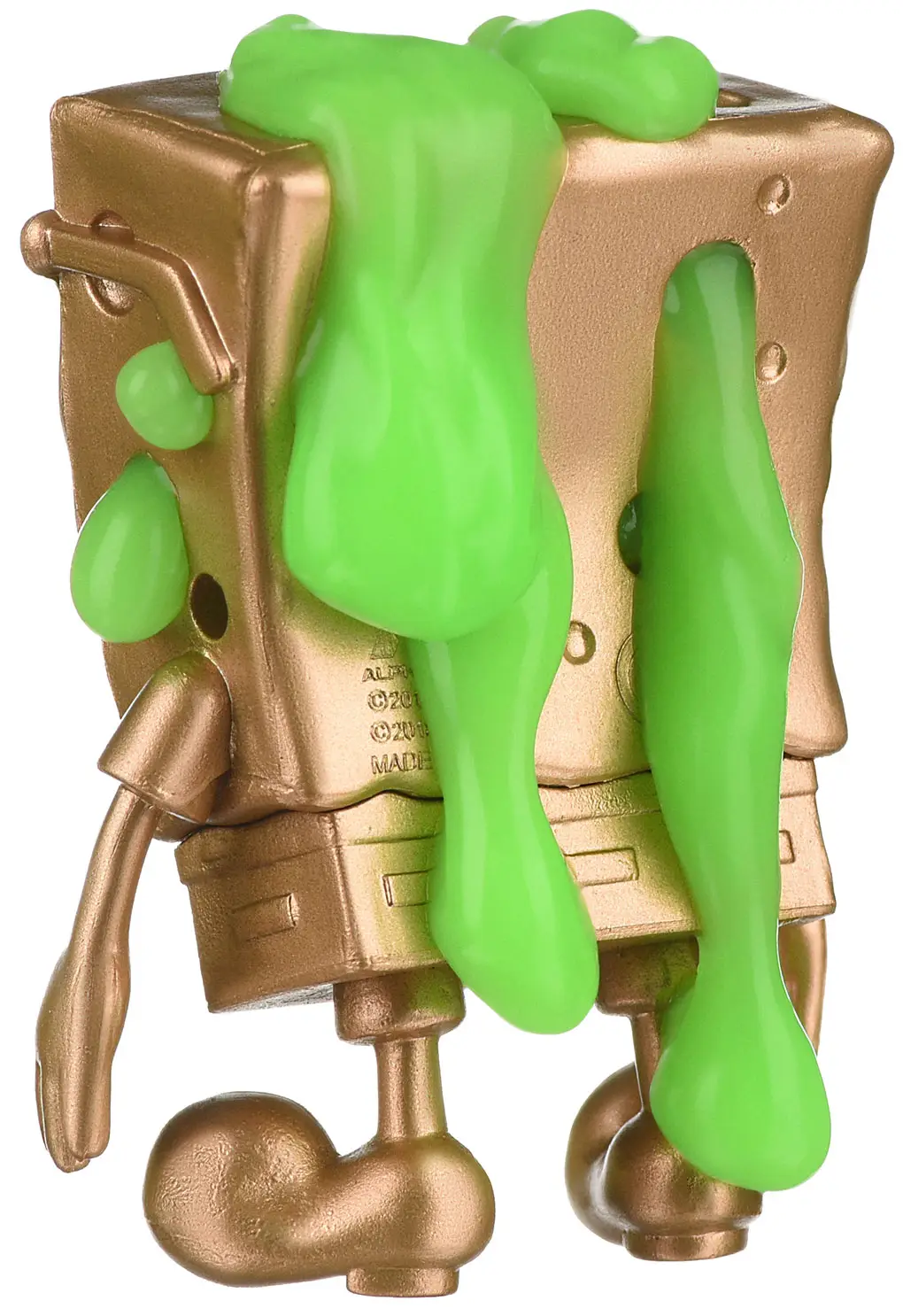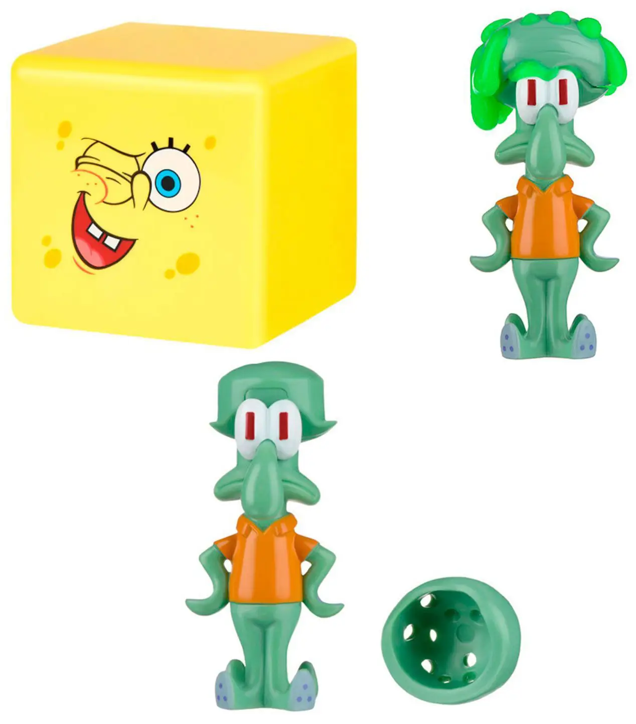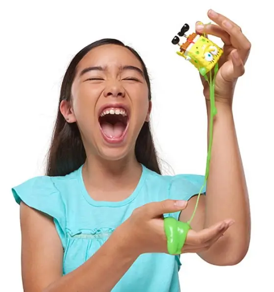 - накачивай квадратную фигурку Губки Боба зеленым слаймом, нажимай на игрушку и смотри, как слизь просачивается на поверхность – получается эффект, как у мочалки, в которую налили гель и вспенили;