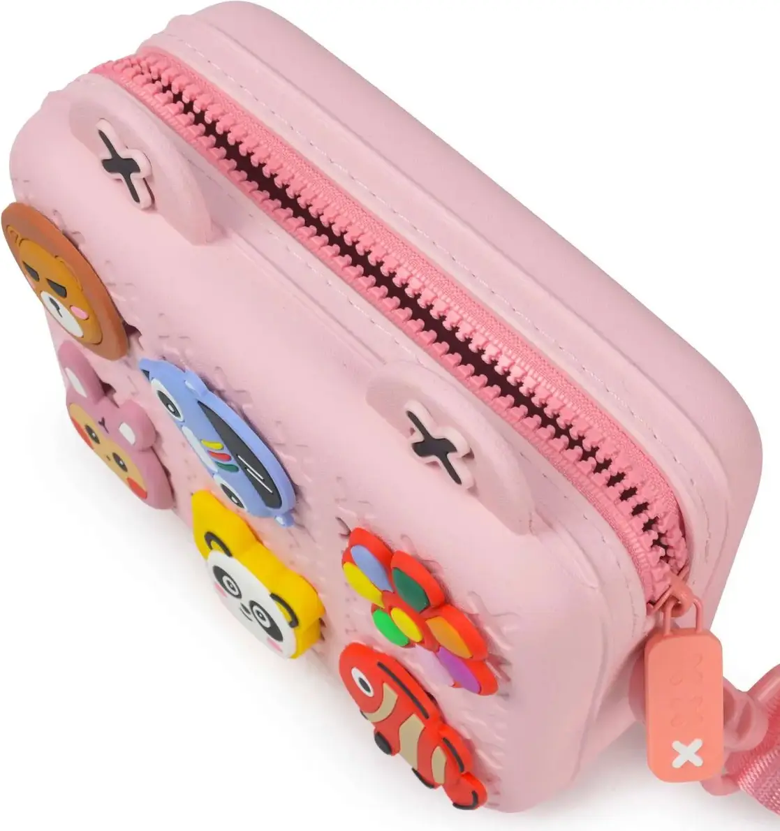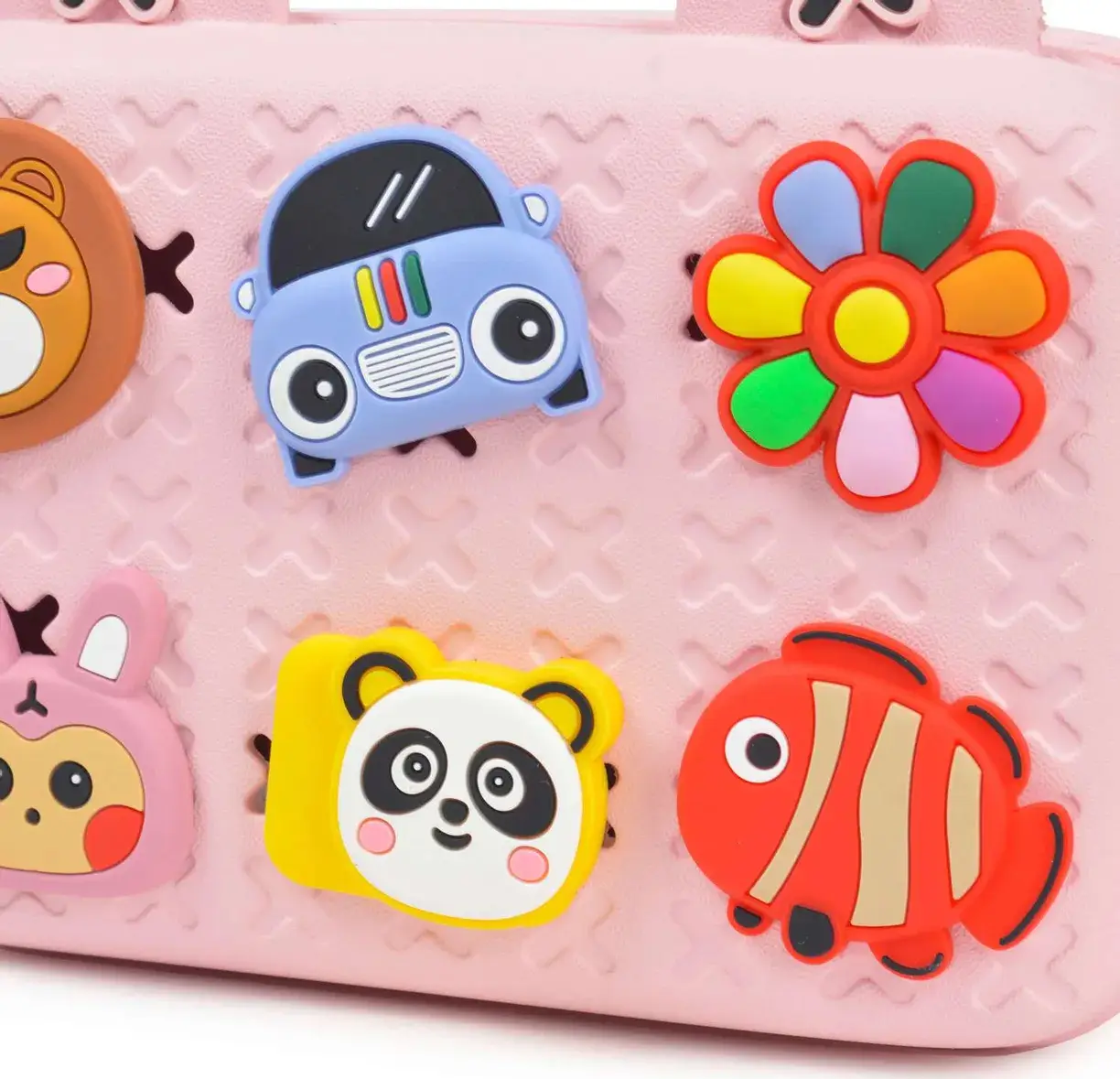 Сумочка от бренда Koool изготовлена из экологически чистого и гипоаллергенного материала ЭВА. Сумку легко мыть и удалять загрязнения. На продукции – свой набор забавных стикеров, которые можно менять местами.