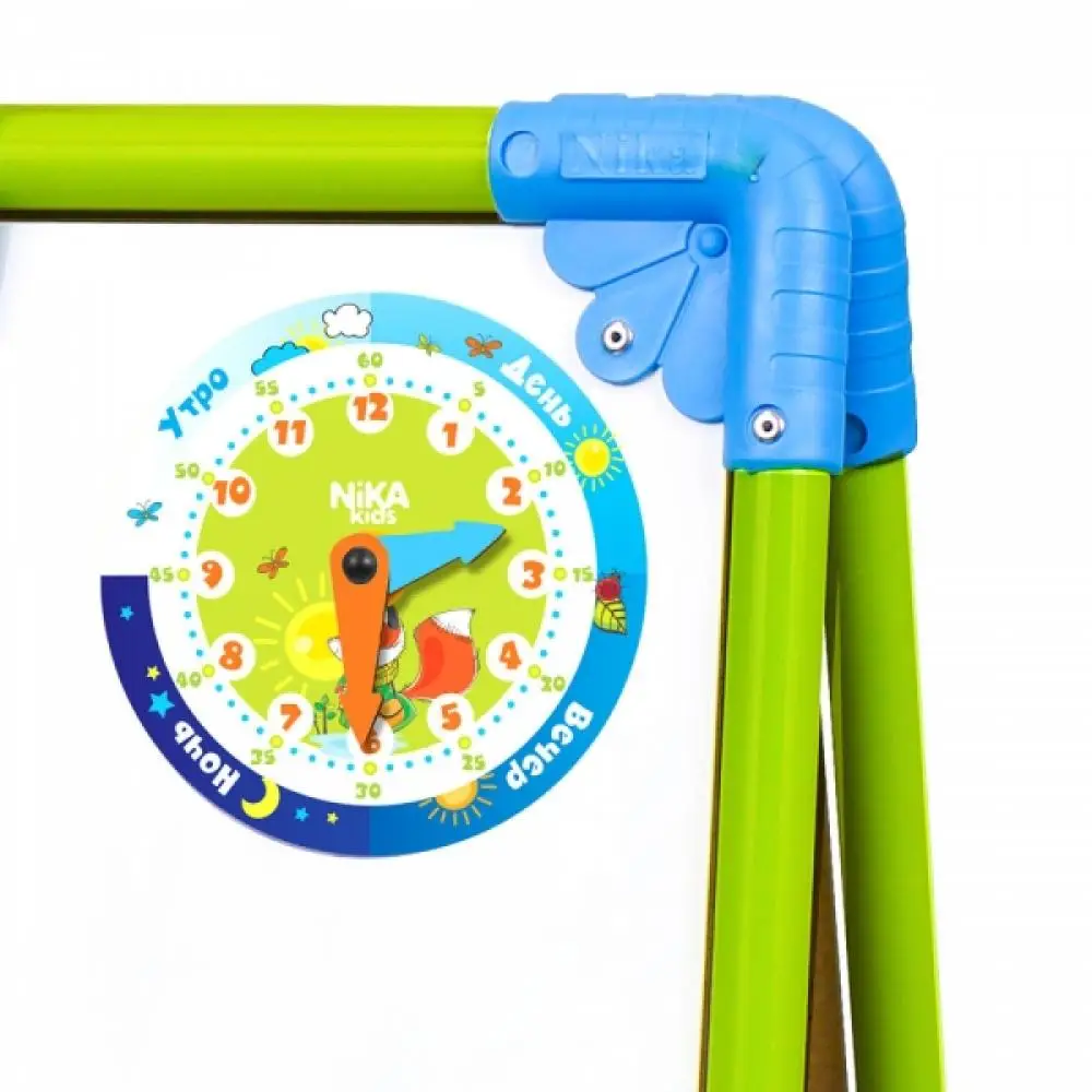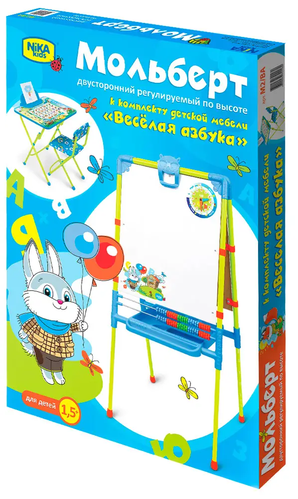 Двухсторонний мольберт с регулируемой высотой, на котором можно рисовать маркерами и мелом. Также он оснащен магнитной доской для использования магнитов, счётами и пеналом для канцелярских принадлежностей. Дополнительно с мольбертом идет набор для творчества, упакованный в мешочек из ткани. Конструкция позволяет менять положение поверхности рисования по высоте в соответствии с ростом ребёнка.