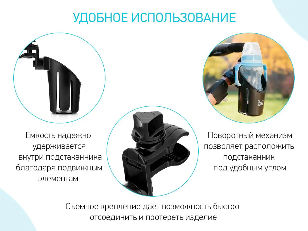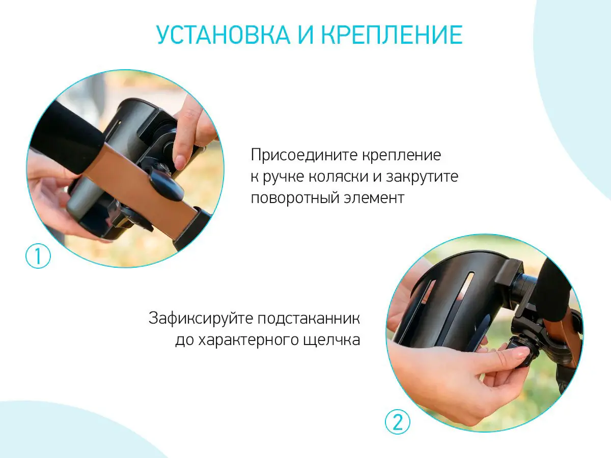 Подстаканник устанавливается в специальное отдельное крепление на коляски надавливанием до щелчка. Плюсы съемного крепления очевидны, потому что если захочется промыть или протереть стакан, не нужно отсоединять его полностью от коляски. Подстаканники удобны в любой ситуации и в любое время года, в них удобно ставить бутылочку или поильник, если малыш потребует перекуса прямо на улице.
