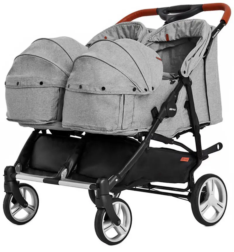 Коляска имеет облегчённую раму, регулируемые в каждом блоке подножку, наклон спинки и капор от солнца. Также можно отметить колёса и амортизационную систему, благодаря которой ребёнок не заметит тряски при езде по плохим дорогам. Обивка состоит из качественного и износостойкого текстиля. В комплекте имеются утепленные чехлы на ножки и 2 люльки-преноски для малышей.