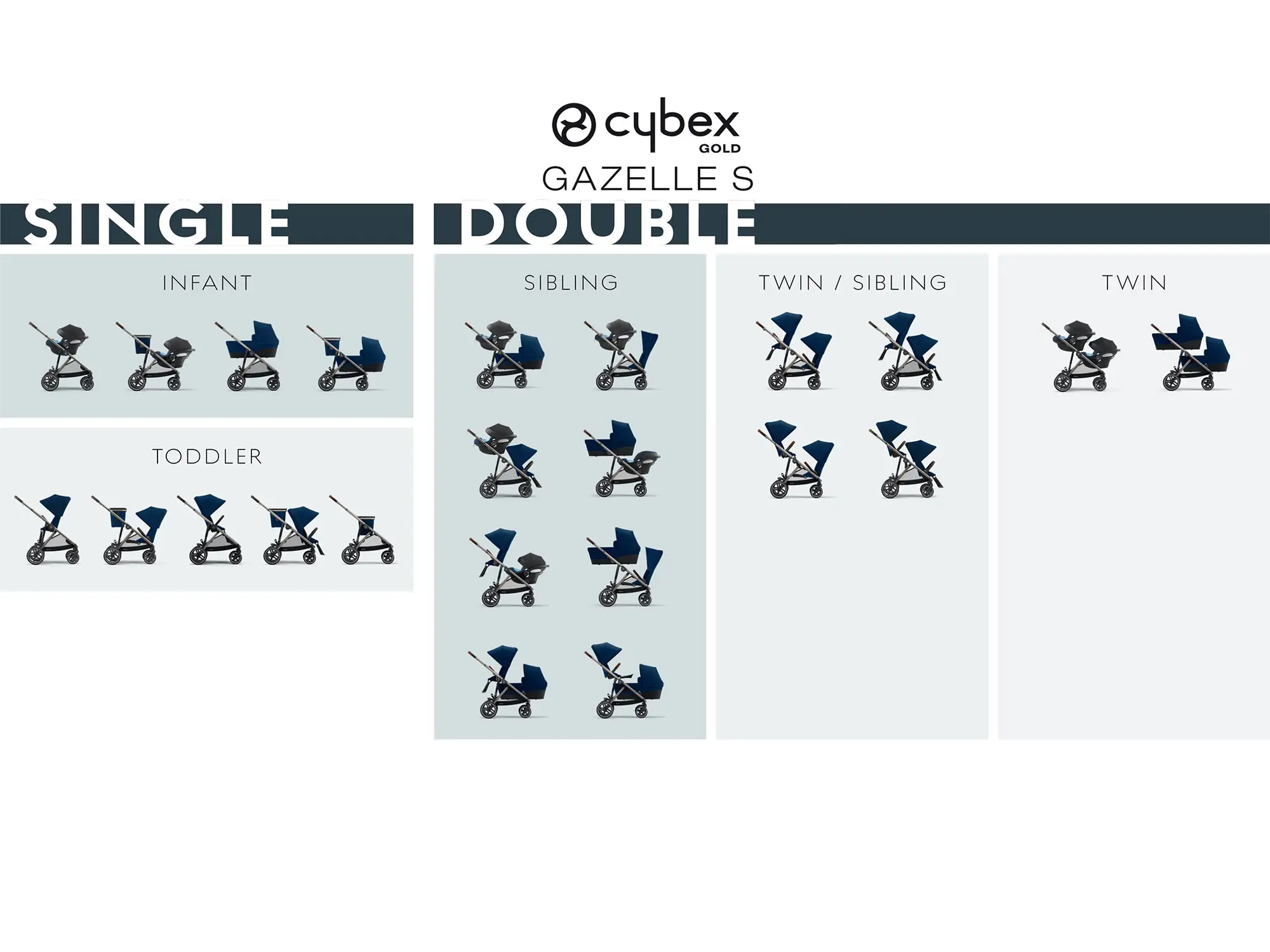Коляска Cybex Gazelle S может быть универсальной прогулочной коляской с впечатляющей вместимостью для покупок до 23 килограмм, а вместе с ребенком вес, который может нести эта коляска, составляет 57 кг. Эта супер-коляска может быть легко трансформирована для двойни или погодок. Cybex Gazelle S – одна коляска, много вариаций.