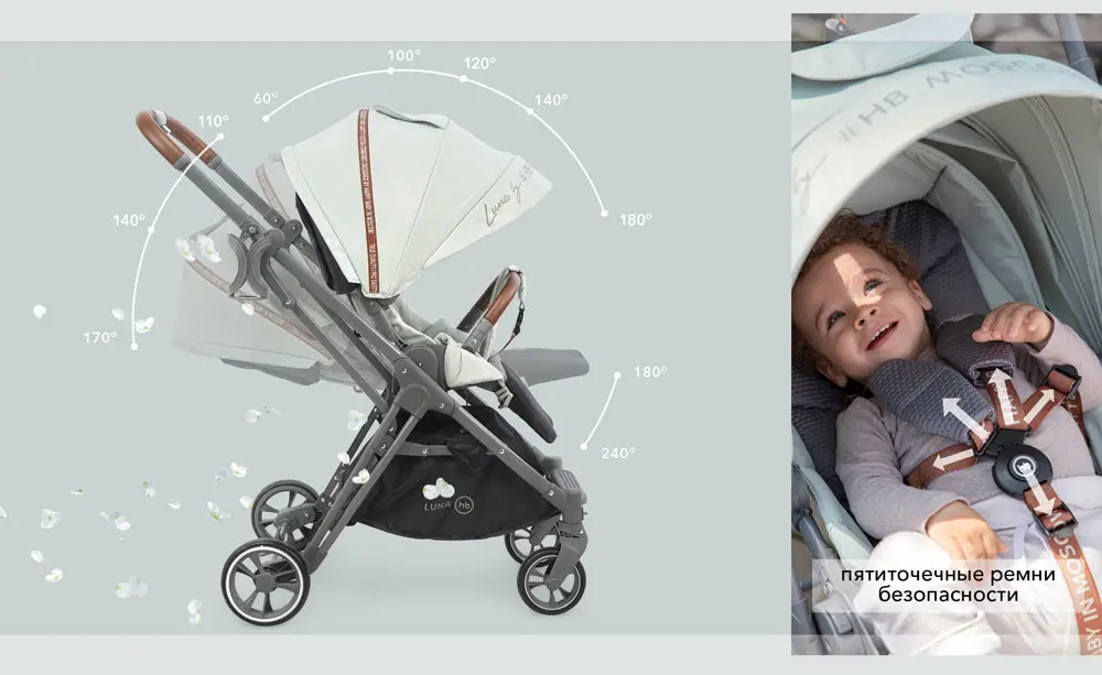 - у подножки есть 2 положения – 180ᵒ для удобства во время сна и 240ᵒ для прогулок в сидячем положении;