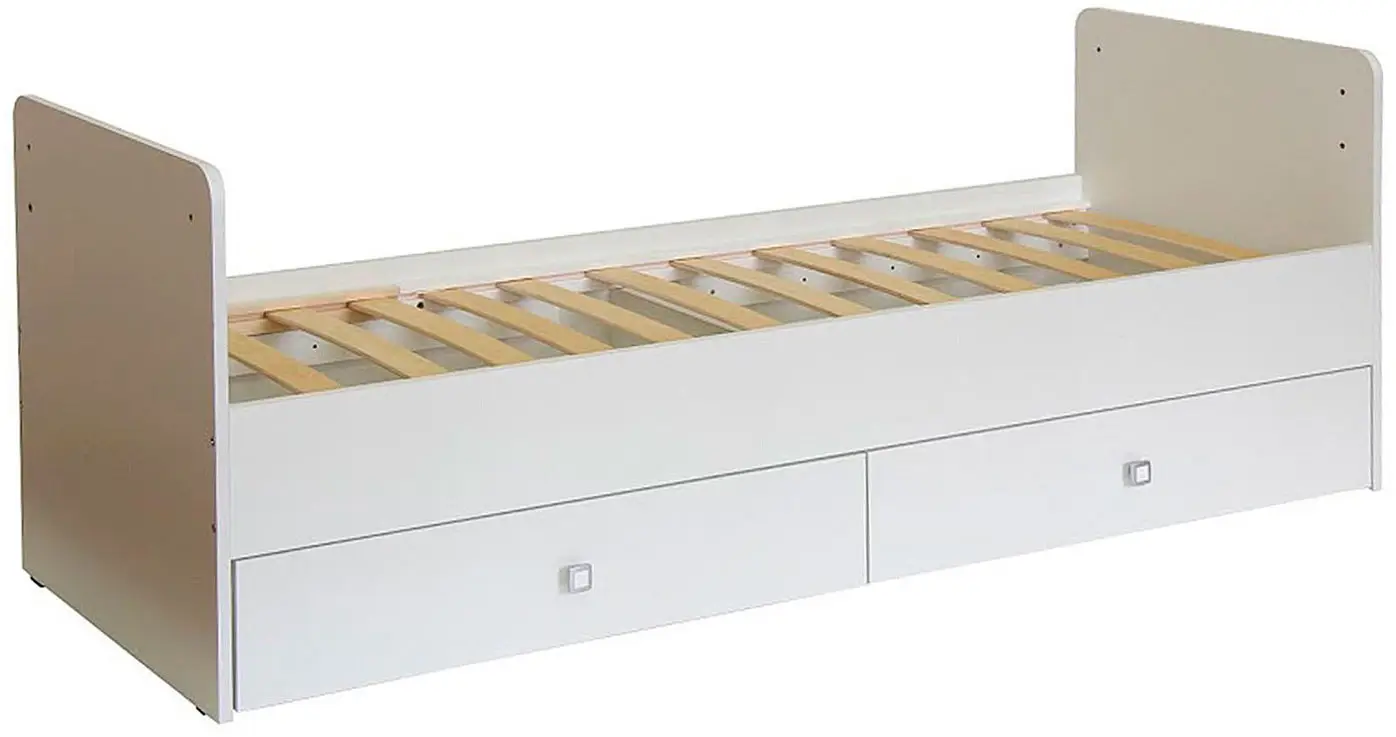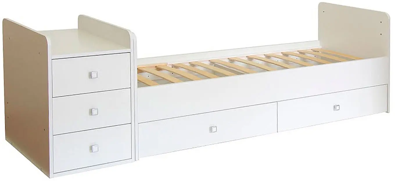 Кроватка-трансформер оснащена механизмом качания, который позволит убаюкать малыша в считанные минуты. Ортопедическое ложе будет способствовать правильному развитию ребёнка. Высота боковины не позволит малышу самостоятельно вылезти из кровати, а опускающийся бортик поможет родителям удобно укладывать и поднимать ребёнка из кроватки. По мере роста ребёнка, вы сможете трансформировать кроватку в кровать для школьника с отдельно стоящим комодом.