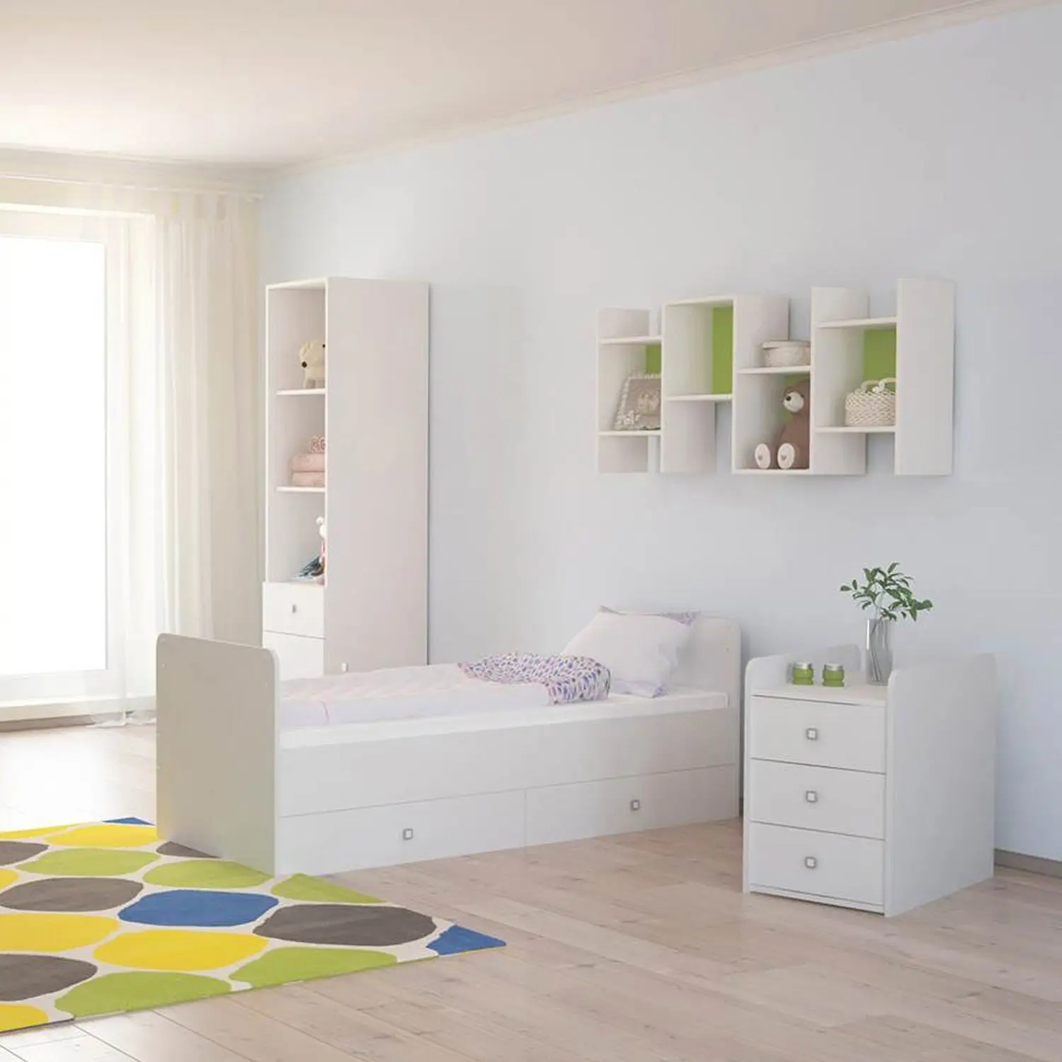 5 вместительных выдвижных ящиков для одежды и игрушек – 2 больших ящика в кровати, 3 ящика в тумбе.