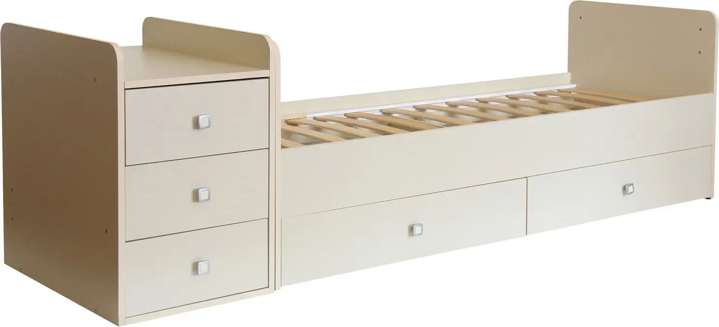 Кроватка-трансформер оснащена механизмом качания, который позволит убаюкать малыша в считанные минуты. Ортопедическое ложе будет способствовать правильному развитию ребёнка. Высота боковины не позволит малышу самостоятельно вылезти из кровати, а опускающийся бортик поможет родителям удобно укладывать и поднимать ребёнка из кроватки. По мере роста ребёнка, вы сможете трансформировать кроватку в кровать для школьника с отдельно стоящим комодом.