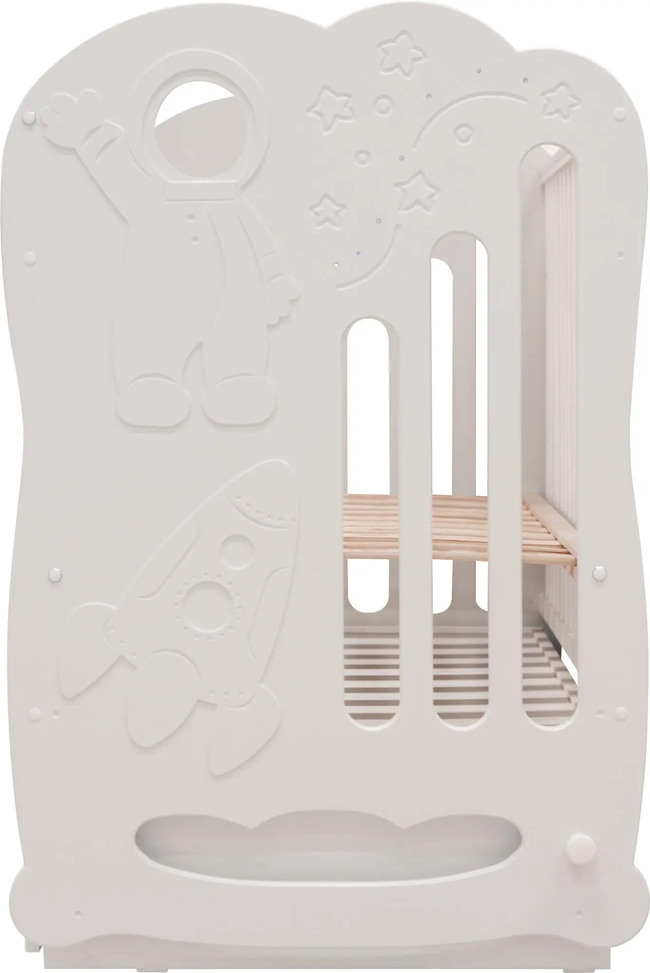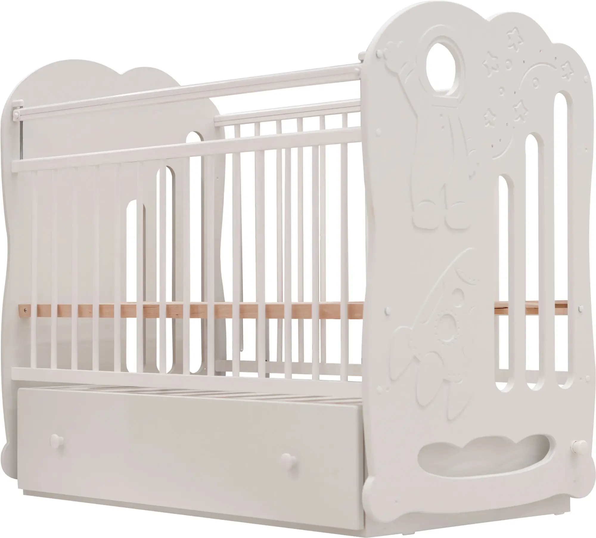 Детская кроватка Космос для новорождённых изготовлена из высококачественных экологически чистых и гипоаллергенных материалов. Спинка данной модели украшена резьбой и аппликацией, а также кристаллами Swarovski. Для укачивания малыша в данной кроватке предусмотрен маятниковый поперечный механизм. Под кроватью имеется ящик, в который можно сложить вещи ребёнка и такие предметы первой необходимости, как подгузники и запасные пелёнки. Когда ребёнок подрастёт, кроватку можно трансформировать в уютный диванчик путем снятия передней боковины.