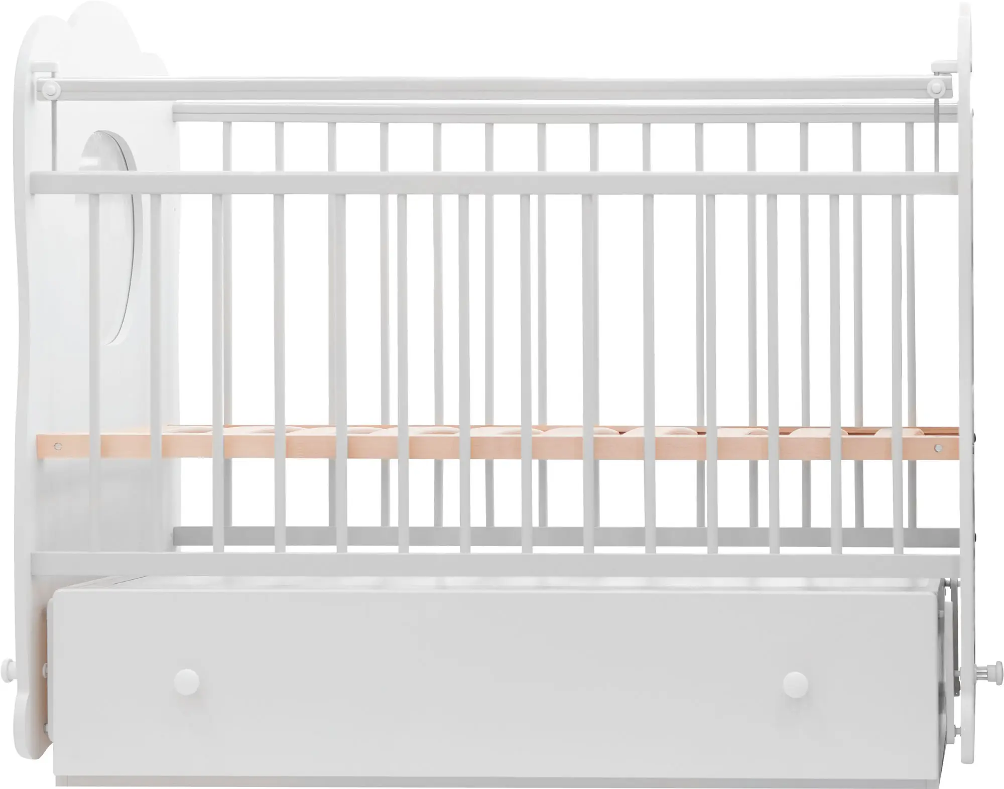 У кровати есть маятниковый механизм поперечного качания (вправо-влево), который может раскачиваться не только тогда, когда вы его качаете, но и когда малыш сам ворочается с боку на бок. Оснащён фиксатором.
