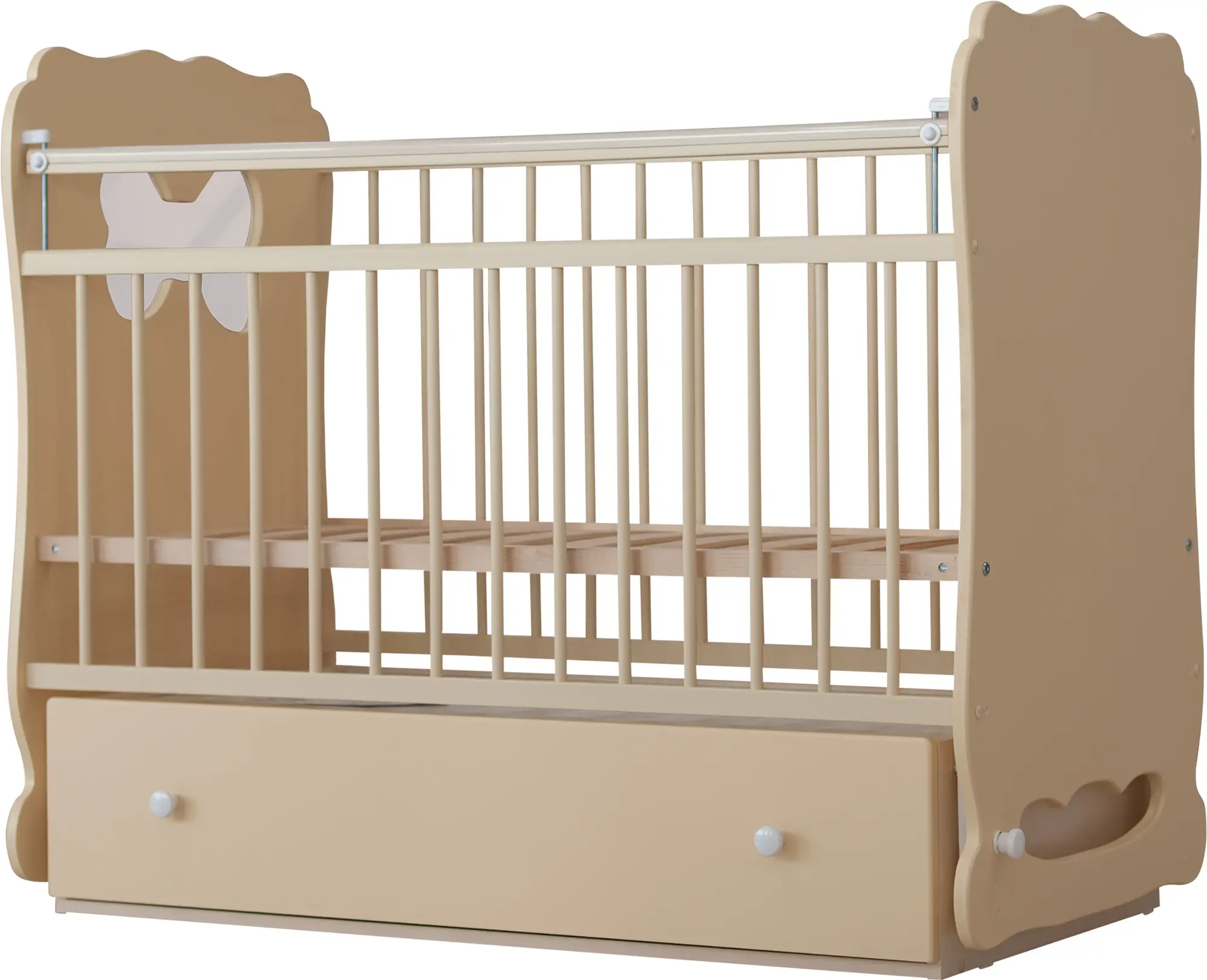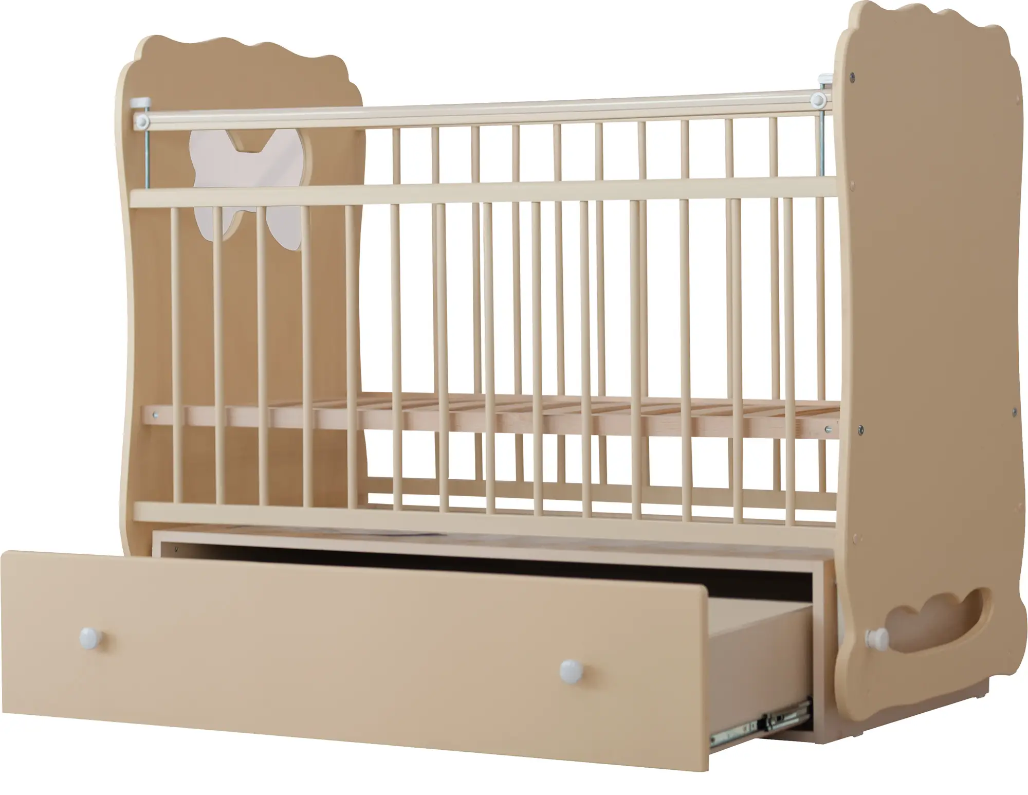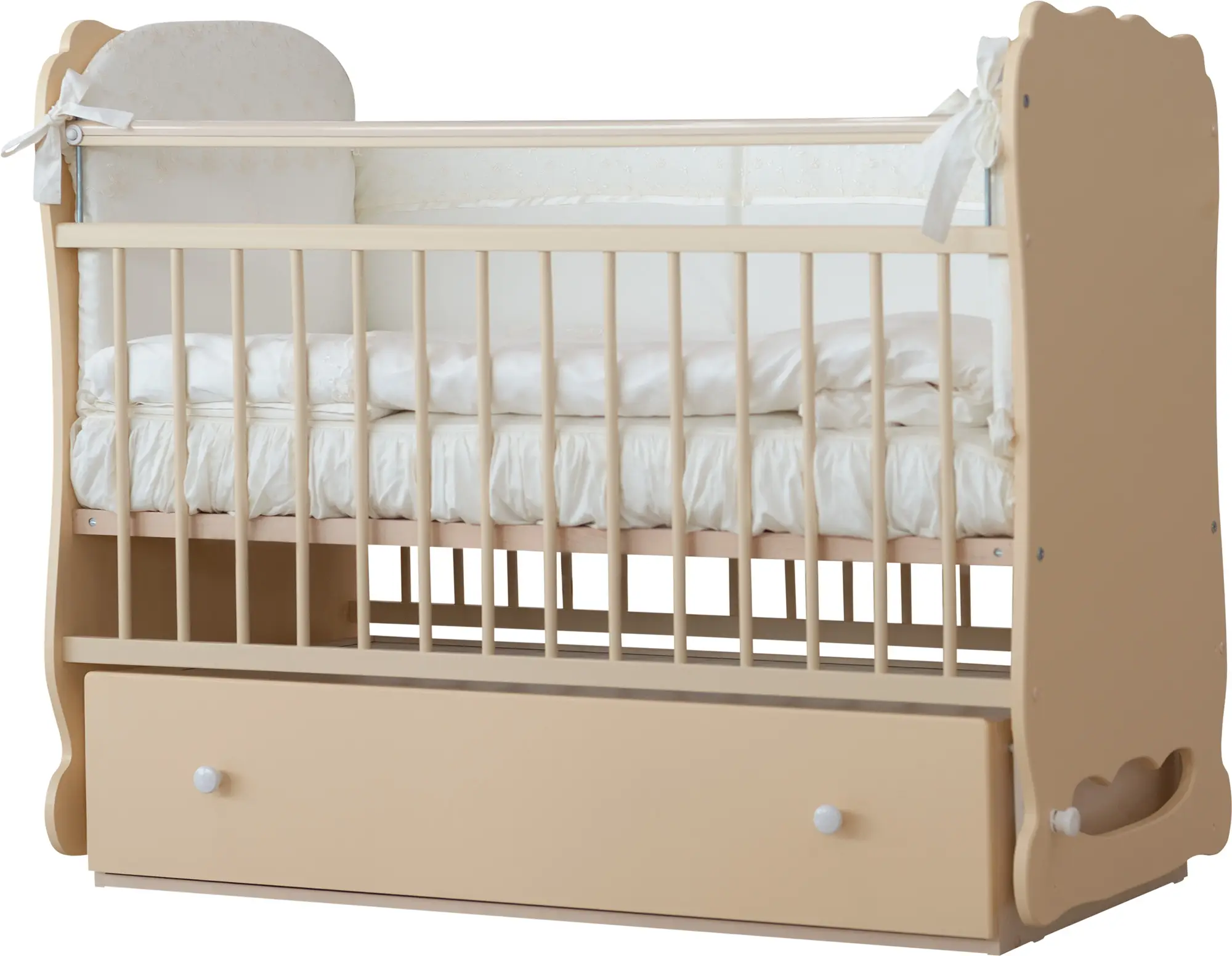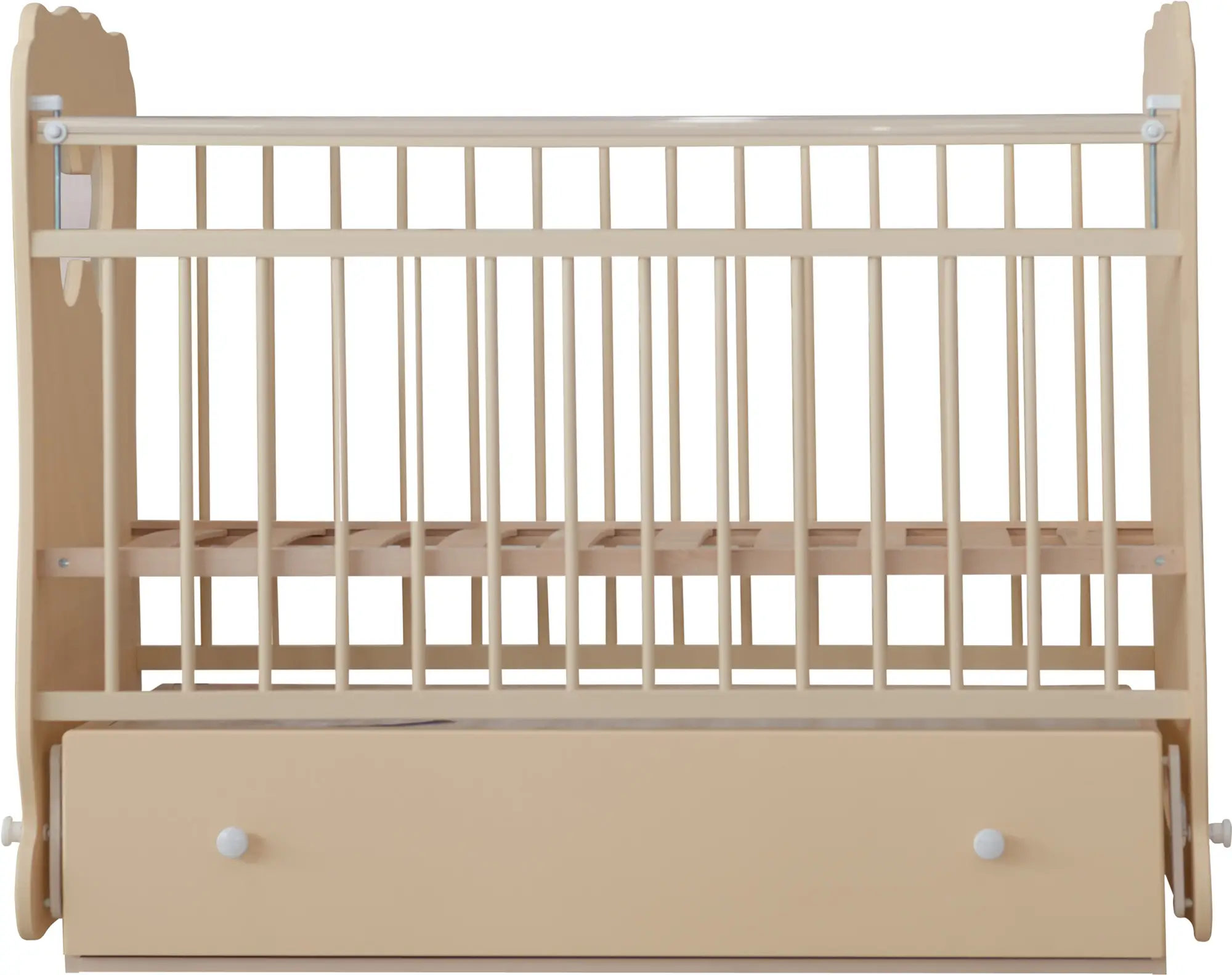 Детская кроватка для новорождённых изготовлена из высококачественных нетоксичных материалов. Спинка данной модели украшена резьбой собственного дизайна. Вся кроватка покрыта безвредным лаком на водной основе, для того чтобы аккуратный внешний вид кроватки сохранялся как можно дольше. Для укачивания малыша в данной кроватке предусмотрен маятниковый поперечный механизм. При необходимости маятник можно зафиксировать. Под кроватью имеется ящик, в который можно сложить вещи первой необходимости – запасные пелёнки, подгузники.