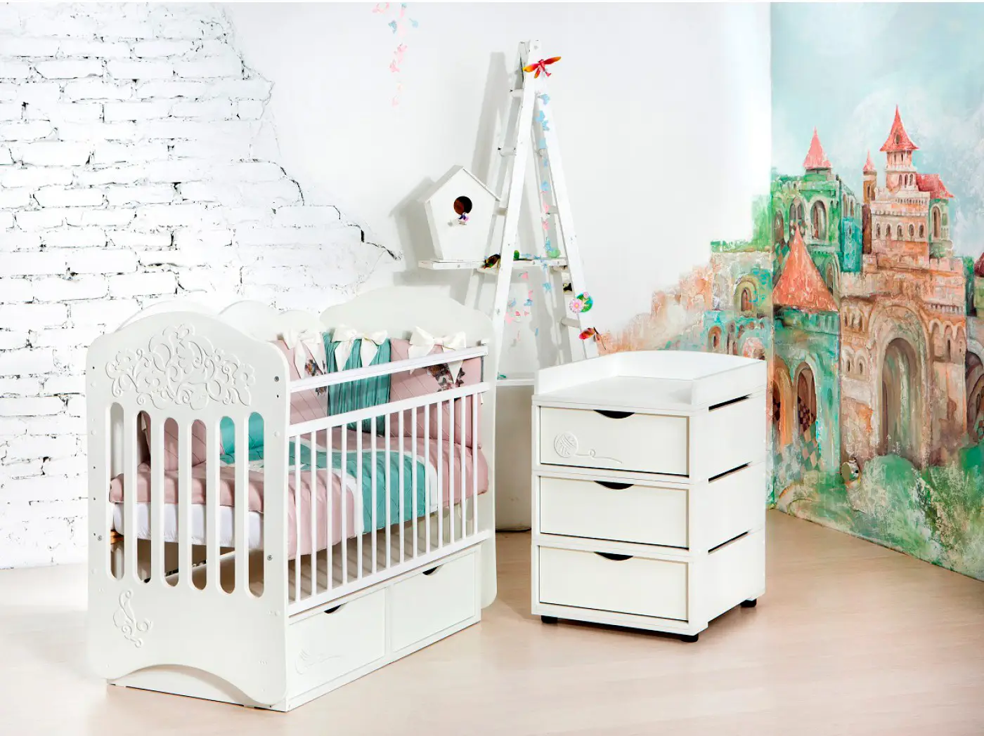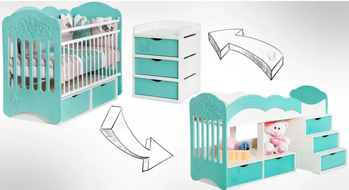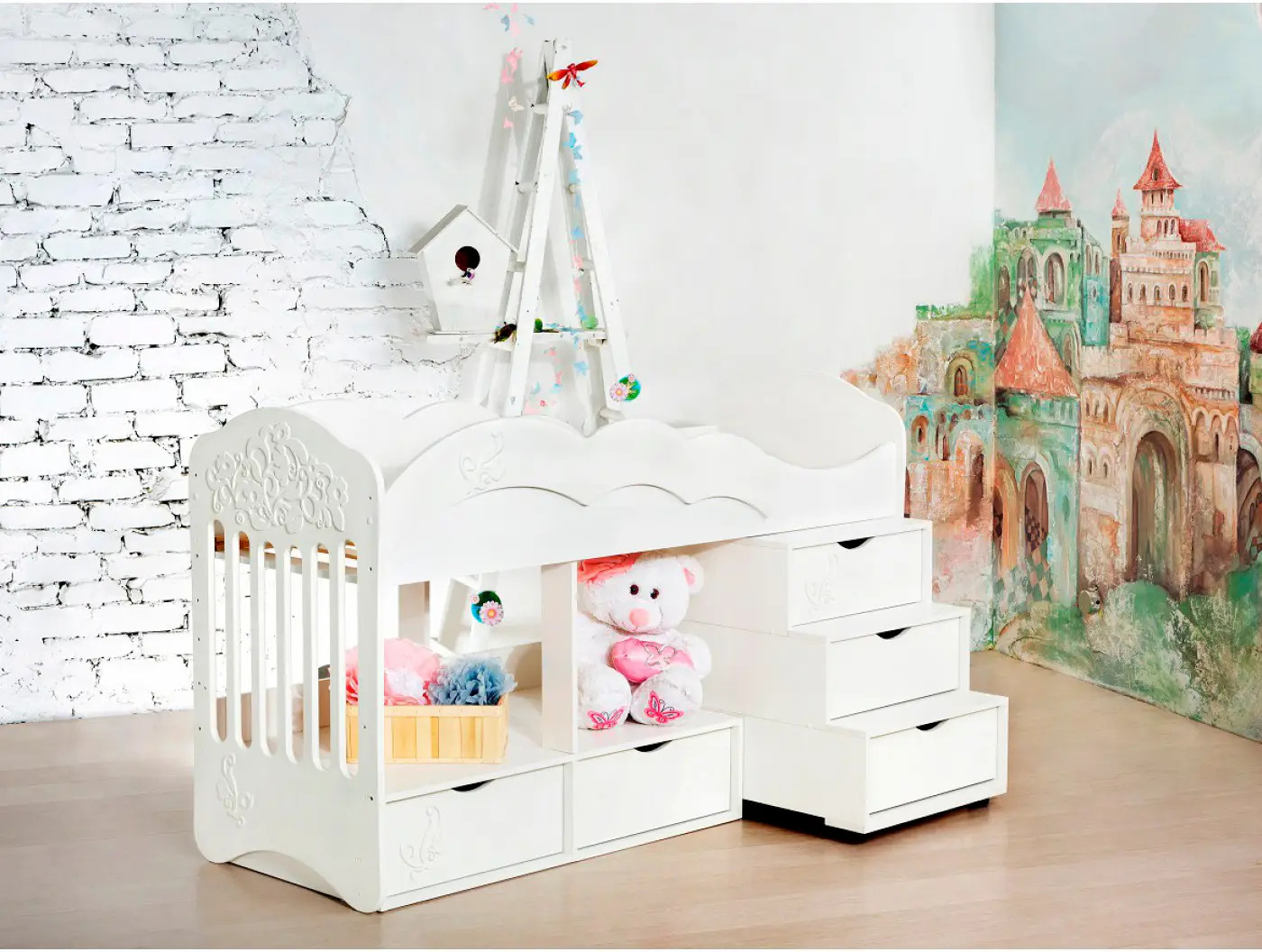 Для новорождённого ребёнка Эльф Виола будет комфортной кроваткой с необходимой регулировкой высоты матрасика, маятником и опускающейся планкой. Под кроваткой будет размещён большой ящик для вещей. Также в комплект сразу входит комод с 3 ящиками и удобной пеленальный поверхностью. Для ребёнка примерно от 3 лет кровать и комод легко трансформируется в просторную кровать-чердак со спальным местом – 170х60 см. Под кроваткой (на первом уровне) будет удобное игровое место с ящиками и полочками. А комод трансформируется в удобную лестницу на второй уровень.