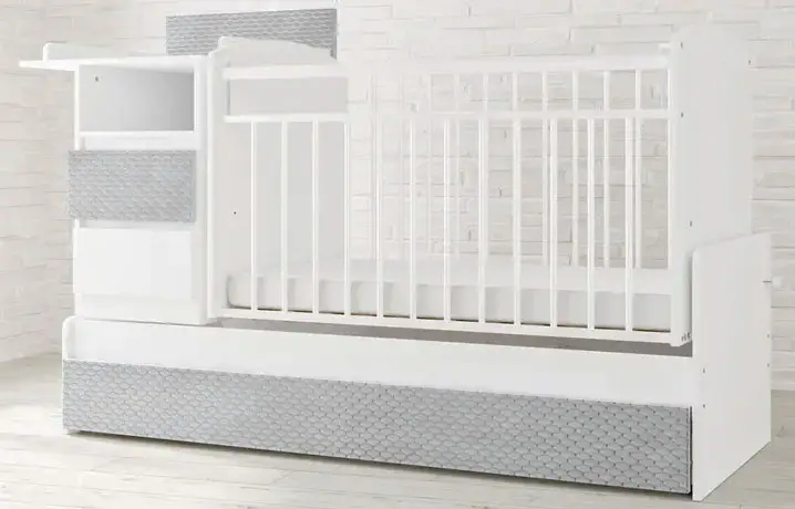 У кроватки предусмотрены силиконовые накладки для режущихся зубиков, пеленальный столик имеет высокие бортики. Ложе имеет несколько положений – 2 для новорождённого, третье для малыша от 3-4 лет, оно так же является ортопедическим, что позволит правильно сформировать осанку вашего ребёнка. Маятник даст возможность быстрее укладывать малыша. Вы сможете сами выбрать, с какой стороны расположить комод с пеленальным столиком. Пеленальный стол имеет мягкое изголовье и бортики, которые защитят вашего малыша. А высота, на которой он расположен, убережёт вашу спину от лишних нагрузок.