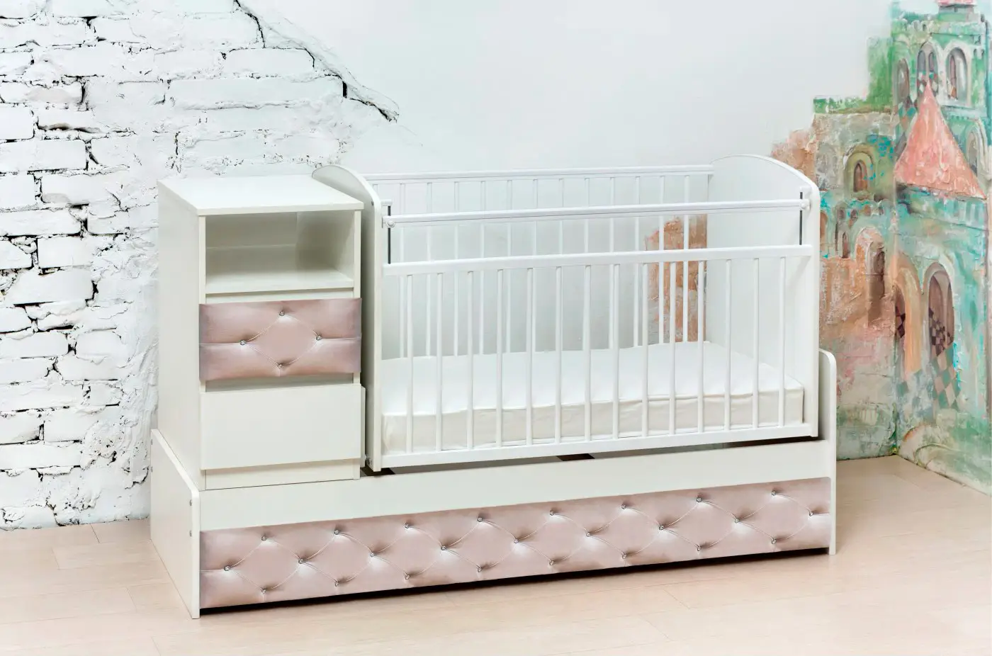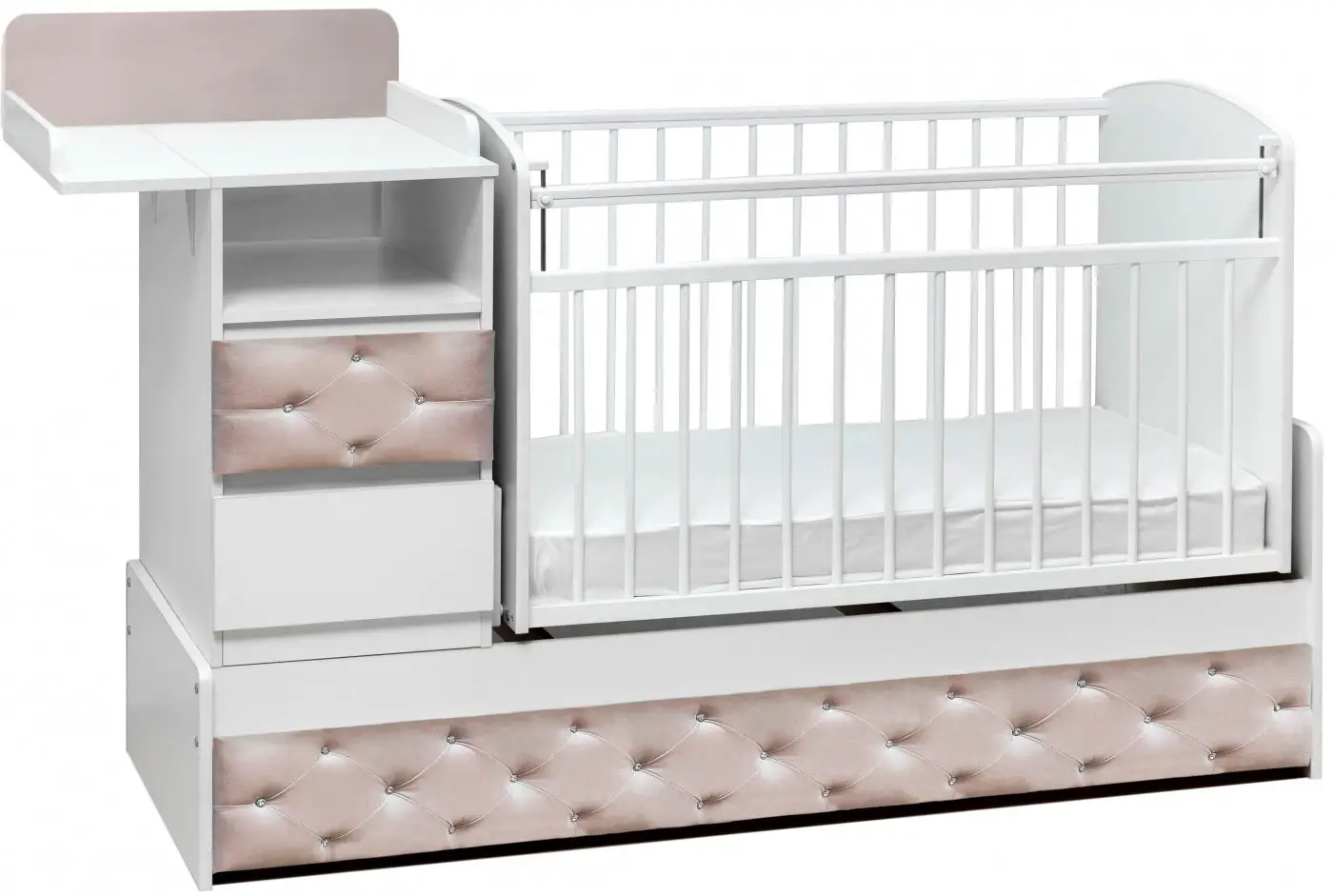 У кроватки предусмотрены силиконовые накладки для режущихся зубиков, пеленальный столик имеет высокие бортики. Ложе имеет несколько положений – 2 для новорождённого, третье для малыша от 3-4 лет, оно так же является ортопедическим, что позволит правильно сформировать осанку вашего ребёнка. Маятник даст возможность быстрее укладывать малыша. Вы сможете сами выбрать, с какой стороны расположить комод с пеленальным столиком. Пеленальный стол имеет мягкое изголовье и бортики, которые защитят вашего малыша. А высота, на которой он расположен, убережёт вашу спину от лишних нагрузок.