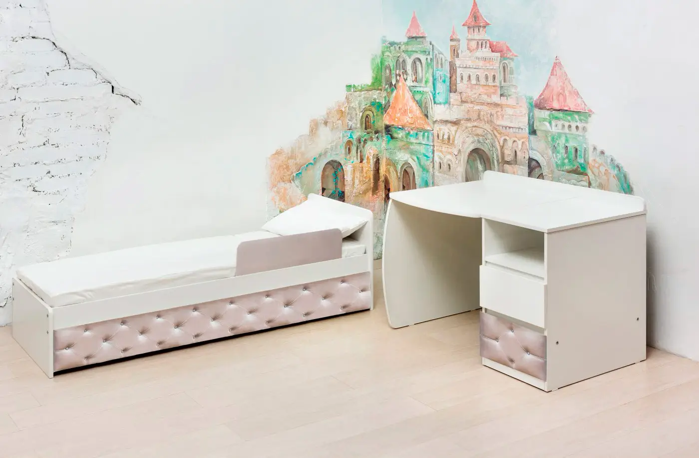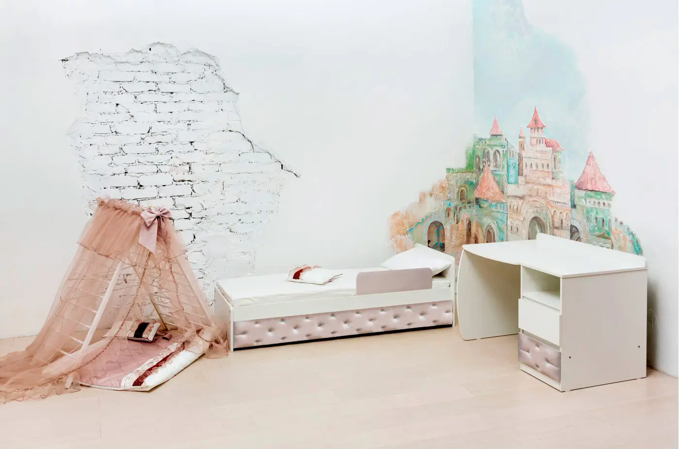 Кровать-трансформер удачно соединила в себе кроватку для младенца, пеленальный стол, подростковую кровать, игровой Вигвам, просторный письменный стол с бортиками и тумбу.