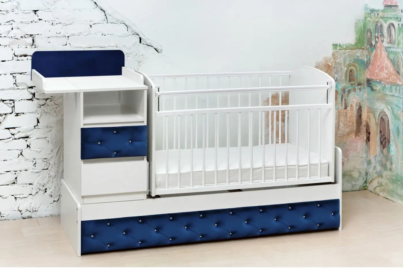 Реечное ортопедическое ложе создаёт дополнительную вентиляцию для матраса. Силиконовые накладки на бортиках защитят зубки малыша, когда они начнут прорезываться. На тумбе есть удобное пространство для пеленания малыша, мягкий матрасик приобретается отдельно.