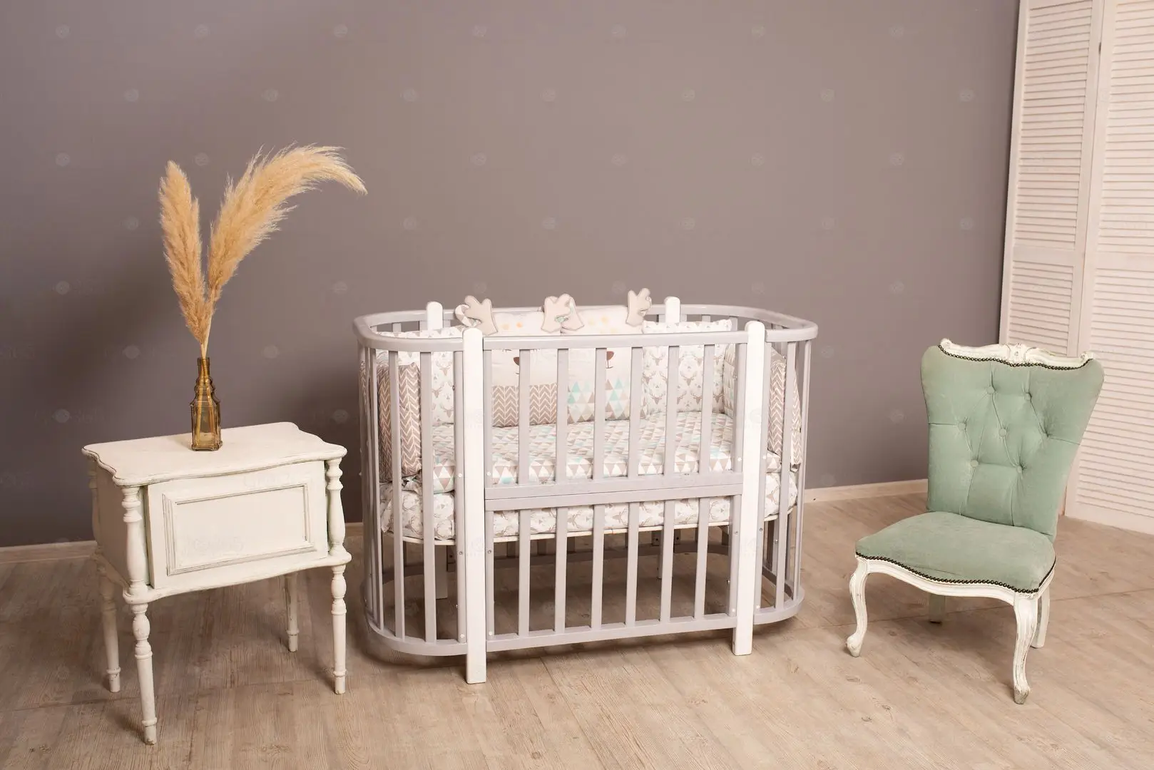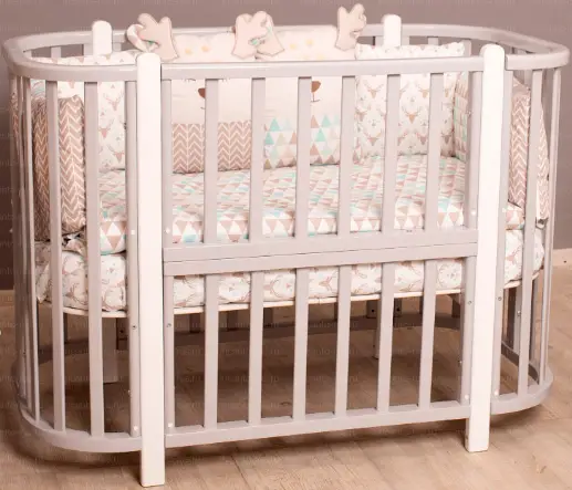 Главной особенностью модели является возможность из стандартной прямоуголной кроватки сделать небольшую кроватку для новорождённого. Уже доказано что ребёнок в первые месяцы после рождения лучше спит в небольшом ограниченном пространстве, там более уютно и спокойно. А в дальнейшем кроватка трансформируется в полноценную овальную кроватку с закруглёнными углами размера 120х60 см. У кроватки простой, но очень красивый внешний вид. Она полностью безопасна для ребёнка и не имеет острых углов.