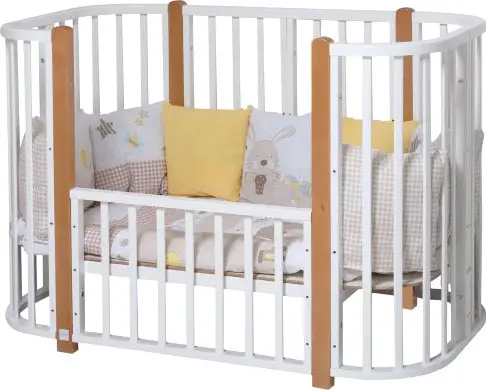 Благодаря современной форме – кроватка впишется в любой интерьер. По мере роста ребёнка кроватка трансформируется в манеж или диванчик для уже подросших детей. Высота кроватки регулируется за счёт установки колес на стойки или на нижний радиус.