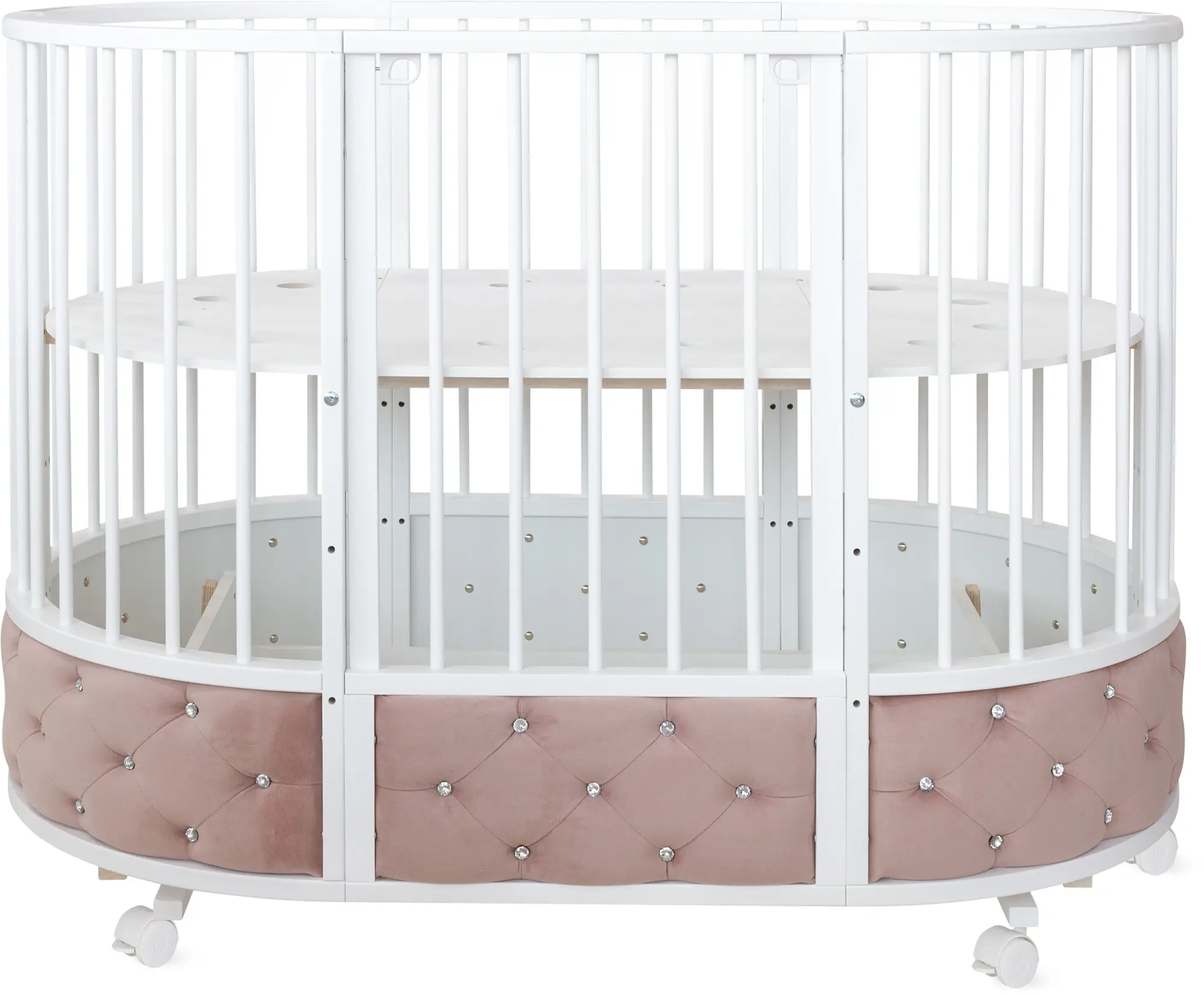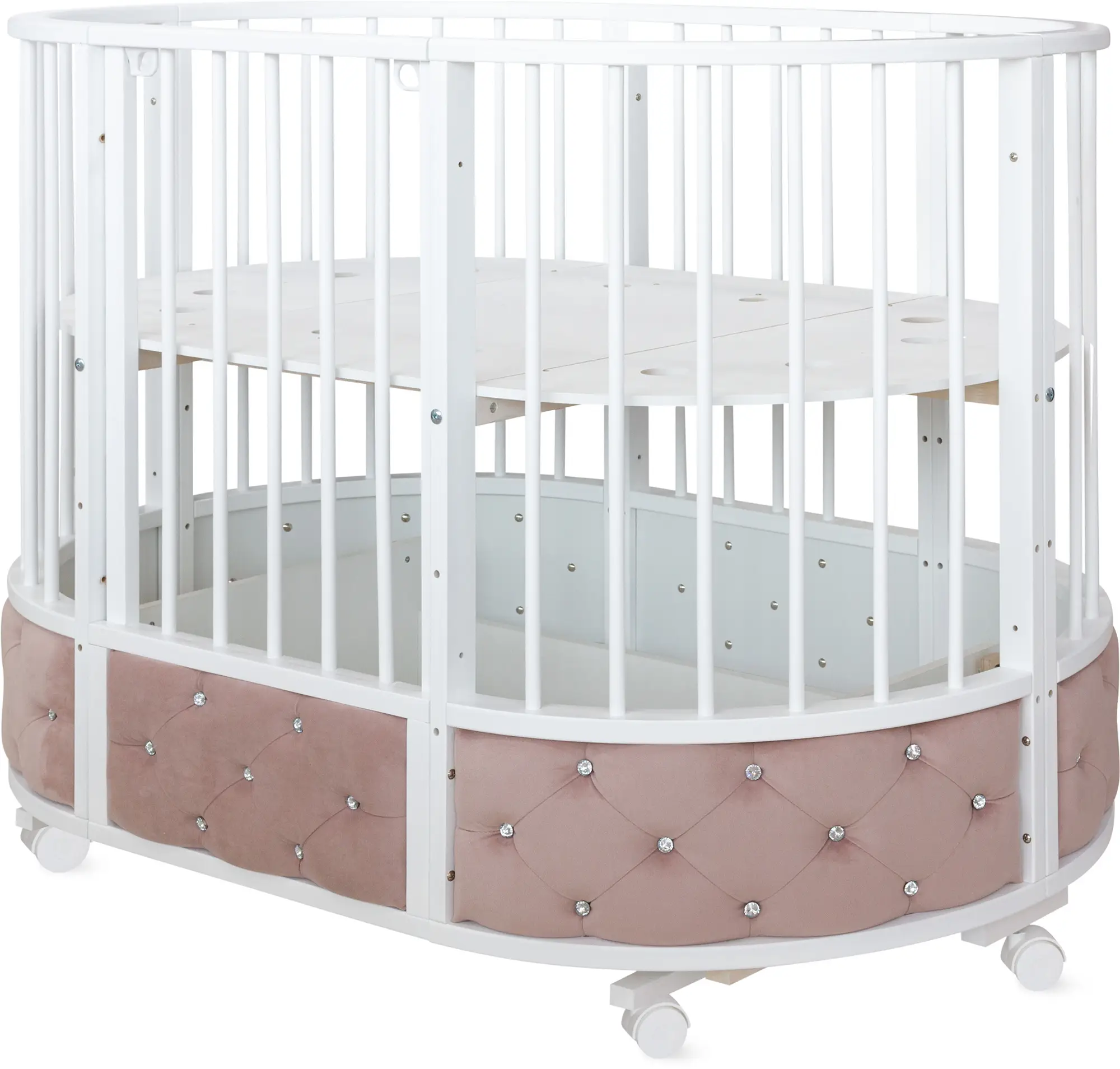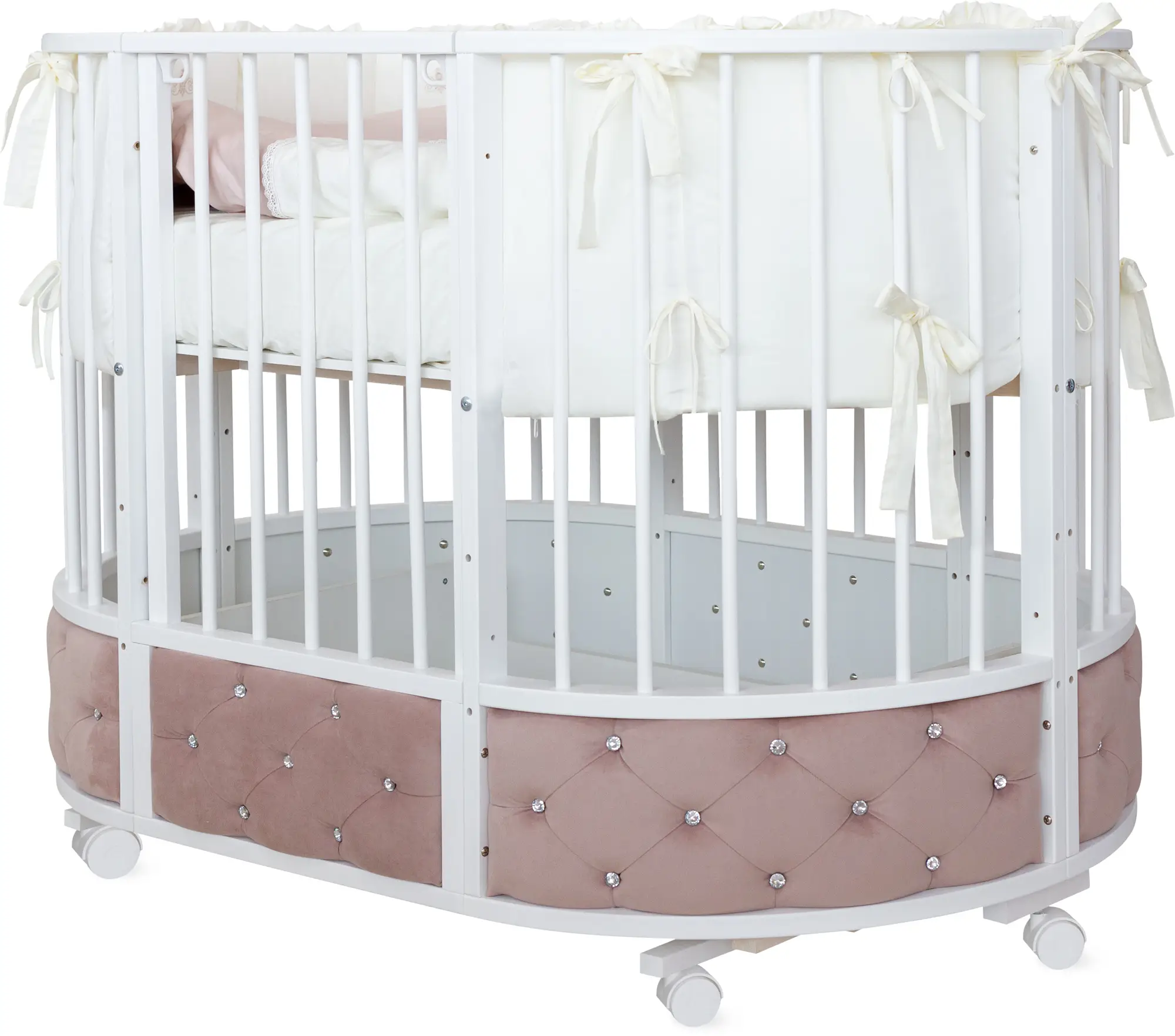 Кроватка изготовлена из высококачественных экологически чистых и гипоаллергенных материалов. Корпус данной модели украшен каретной стяжкой и стразами. Для укачивания малыша предусмотрен маятниковый поперечный механизм. При необходимости маятник можно зафиксировать. Трансформирование происходит из круглой кроватки для детей до 6 месячного возраста в овальную крвоатку, которая прослужит ребёнку до 6 лет.