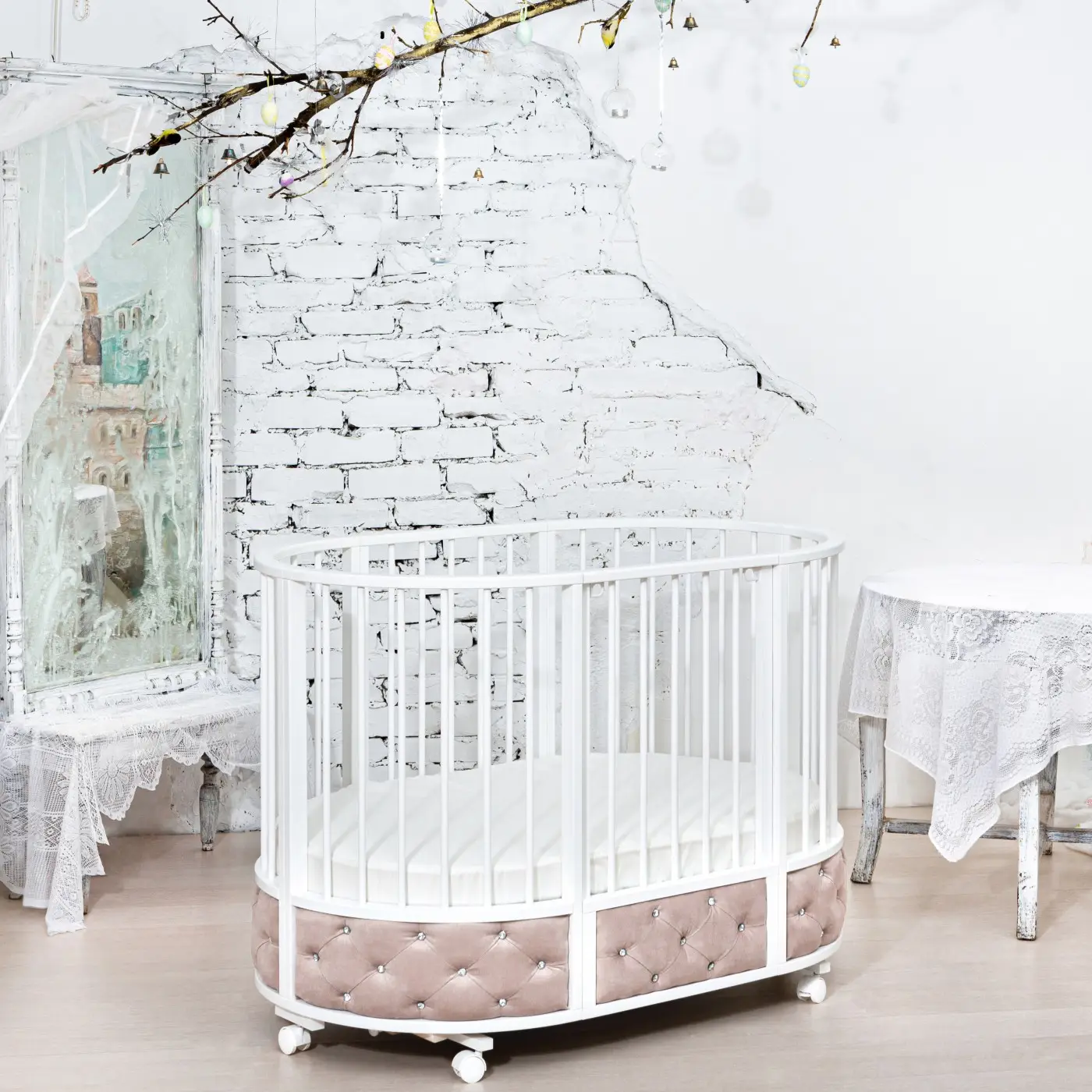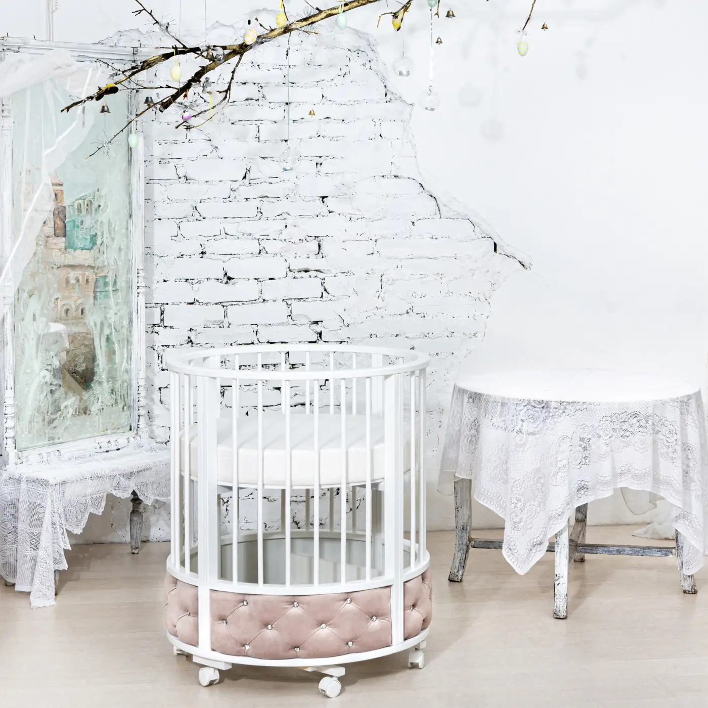 Круглая кроватка-трансформер c маятниковым механизмом поперечного качания для новорождённых элегантно впишется в детскую комнату и прослужит малышу до 6 лет.