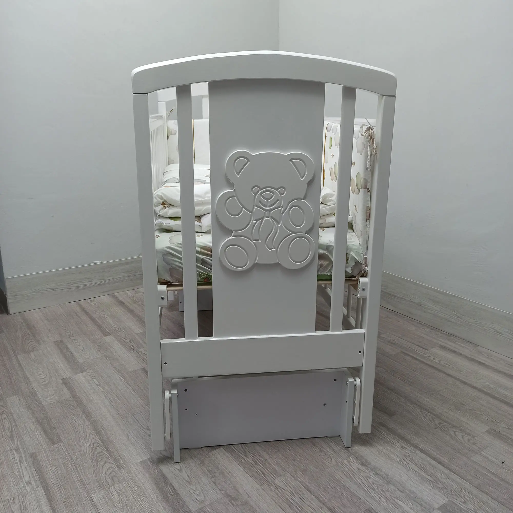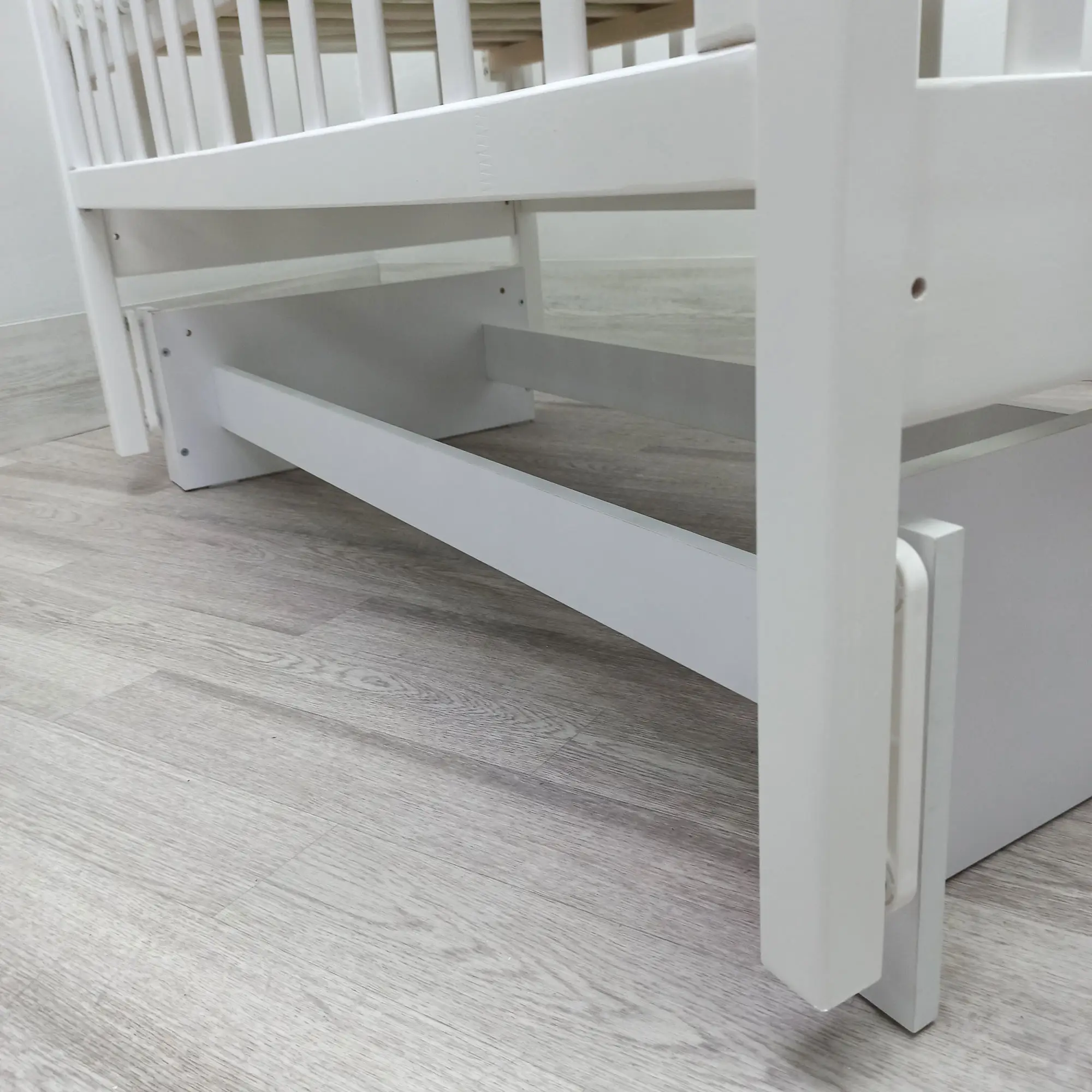Кроватка оборудована самым простым и надёжным механизмом опускания боковин, который позволяет бесшумно опускать и поднимать боковую часть кроватки. При этом исключена возможность ребёнку самому это сделать. На кроватку установлен универсальный маятниковый механизм, позволяющий мягко укачивать малыша. Поперечный маятник качает кроватку как колыбельку из стороны в сторону. Когда ребёнок подрастёт, маятниковый механизм снимается и кровать устанавливается на ножки. Снизу кроватки располагается удобный выдвижной ящик, в который можно сложить детские вещи.