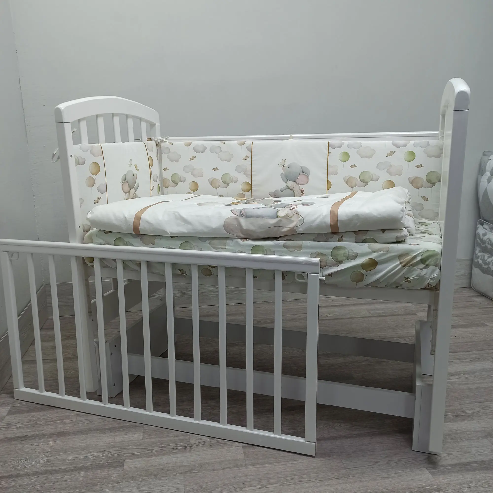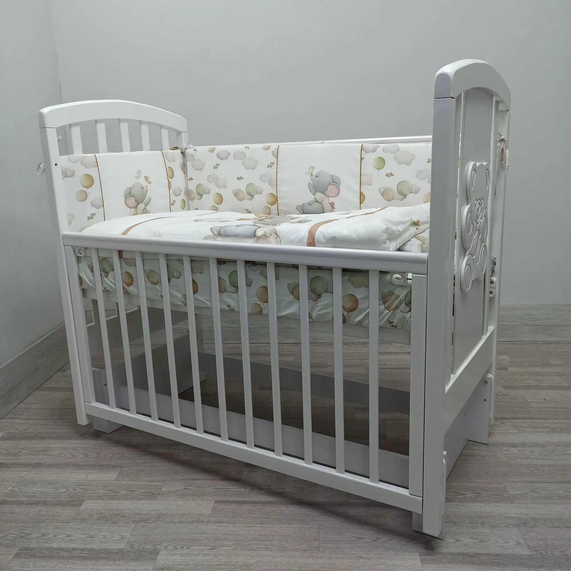 Кроватка изготовлена из массива берёзы. Покрытие нетоксичным и безвредным лаком.