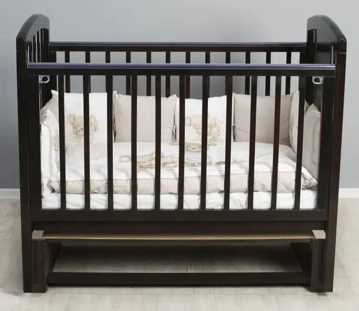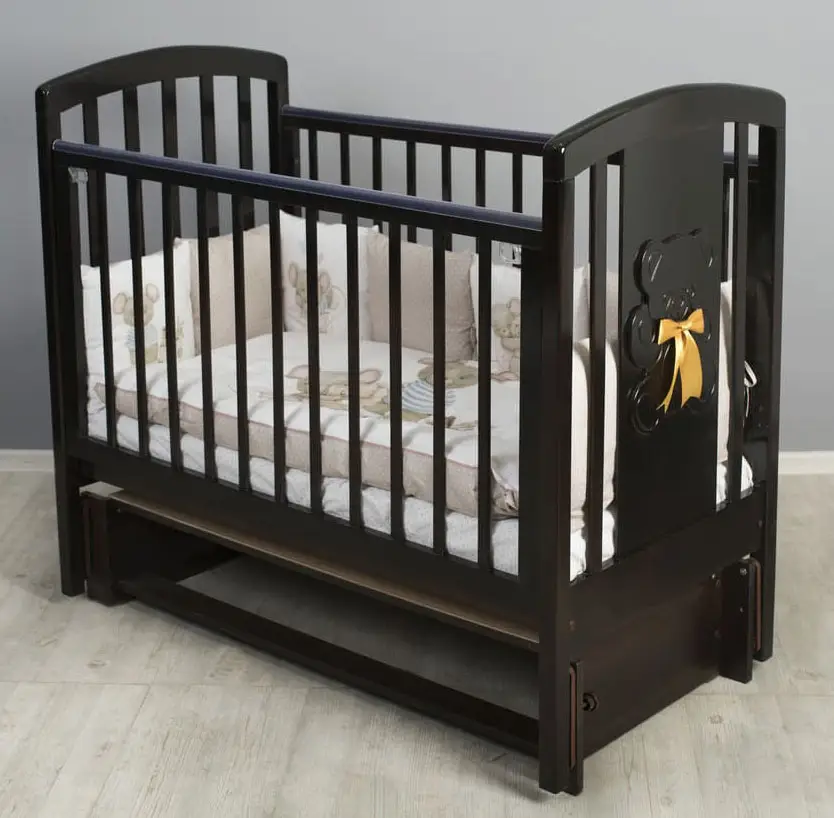 Кроватка оборудована самым простым и надёжным механизмом опускания боковин, который позволяет бесшумно опускать и поднимать боковую часть кроватки. При этом исключена возможность ребёнку самому это сделать. На кроватку установлен универсальный маятниковый механизм, позволяющий мягко укачивать малыша. Поперечный маятник качает кроватку как колыбельку из стороны в сторону. Когда ребёнок подрастёт, маятниковый механизм снимается и кровать устанавливается на ножки. Снизу кроватки располагается удобный выдвижной ящик, в который можно сложить детские вещи.