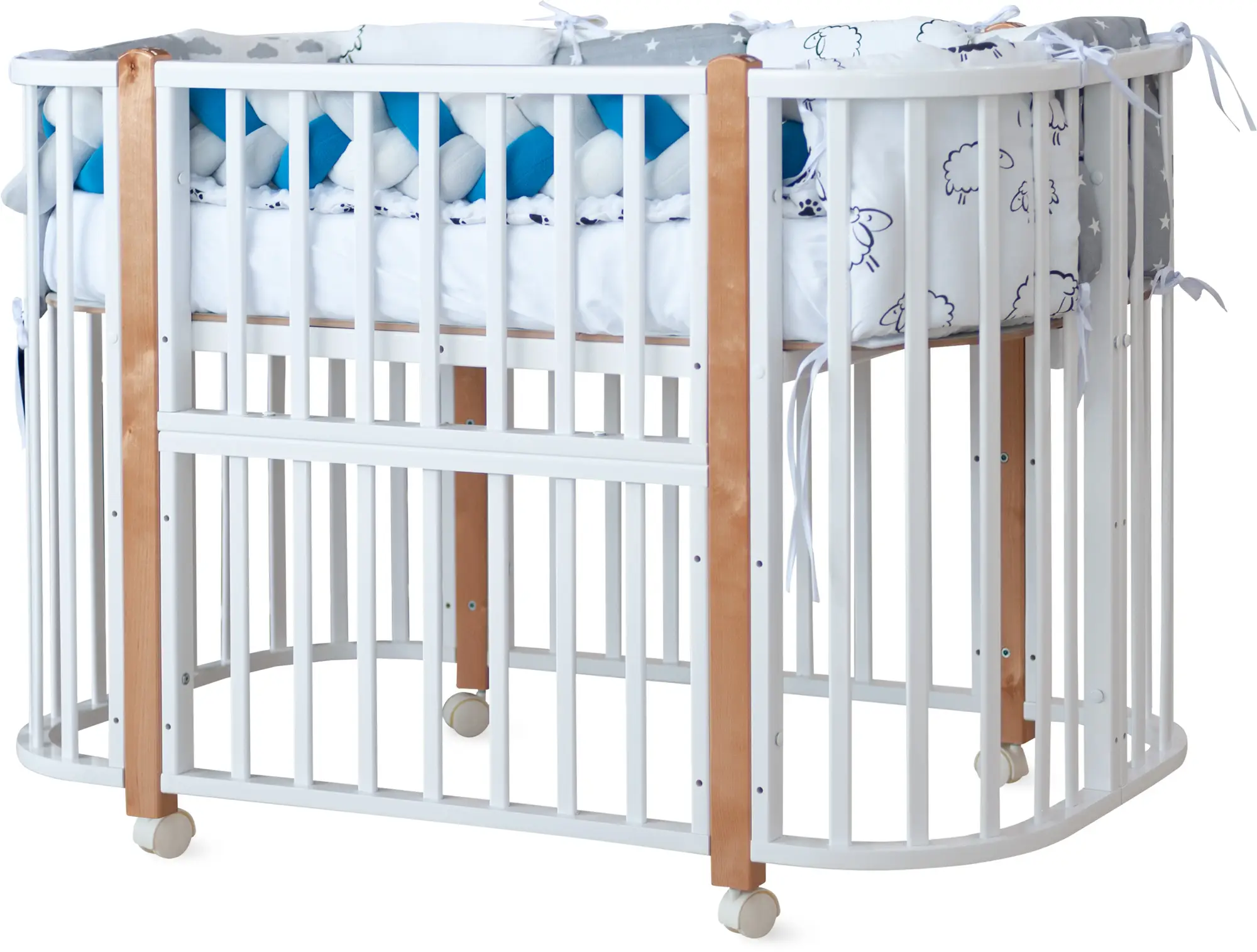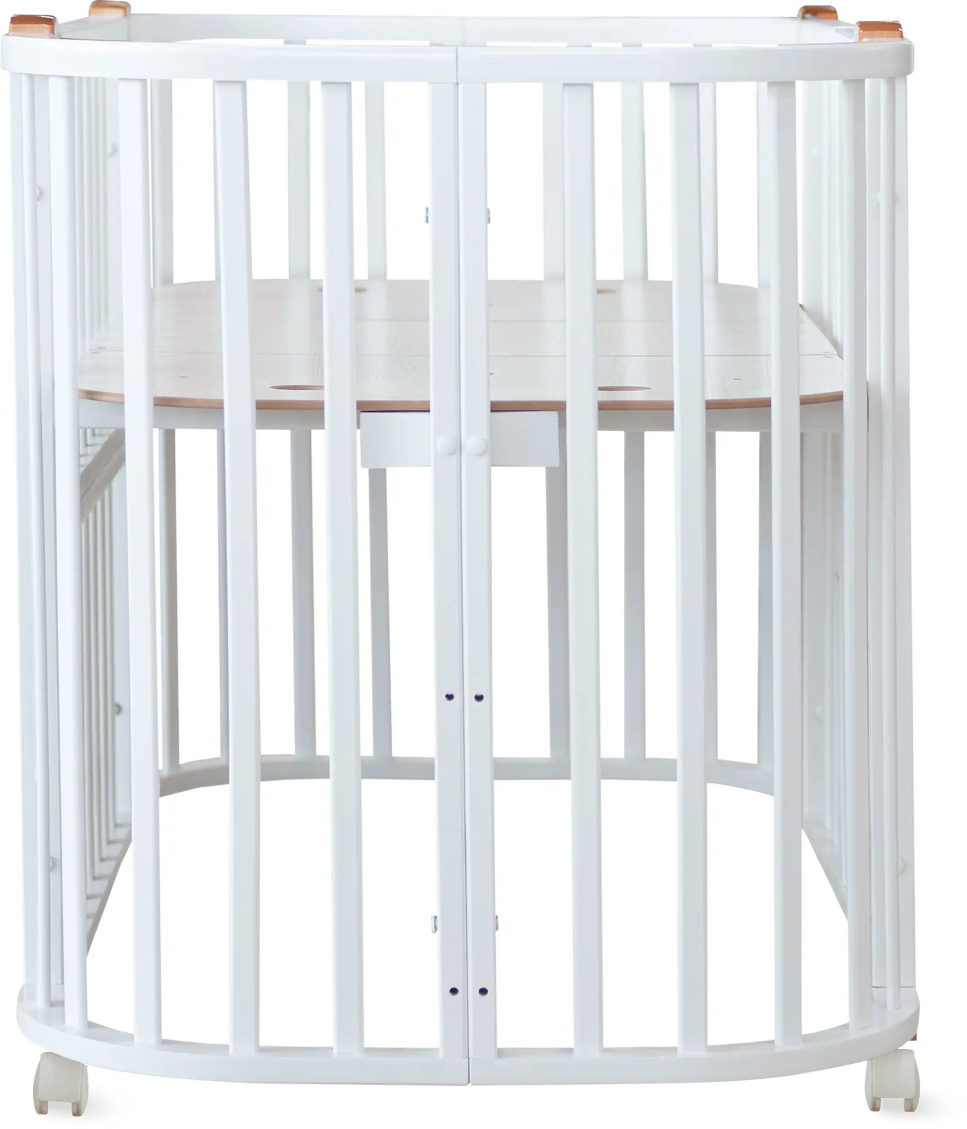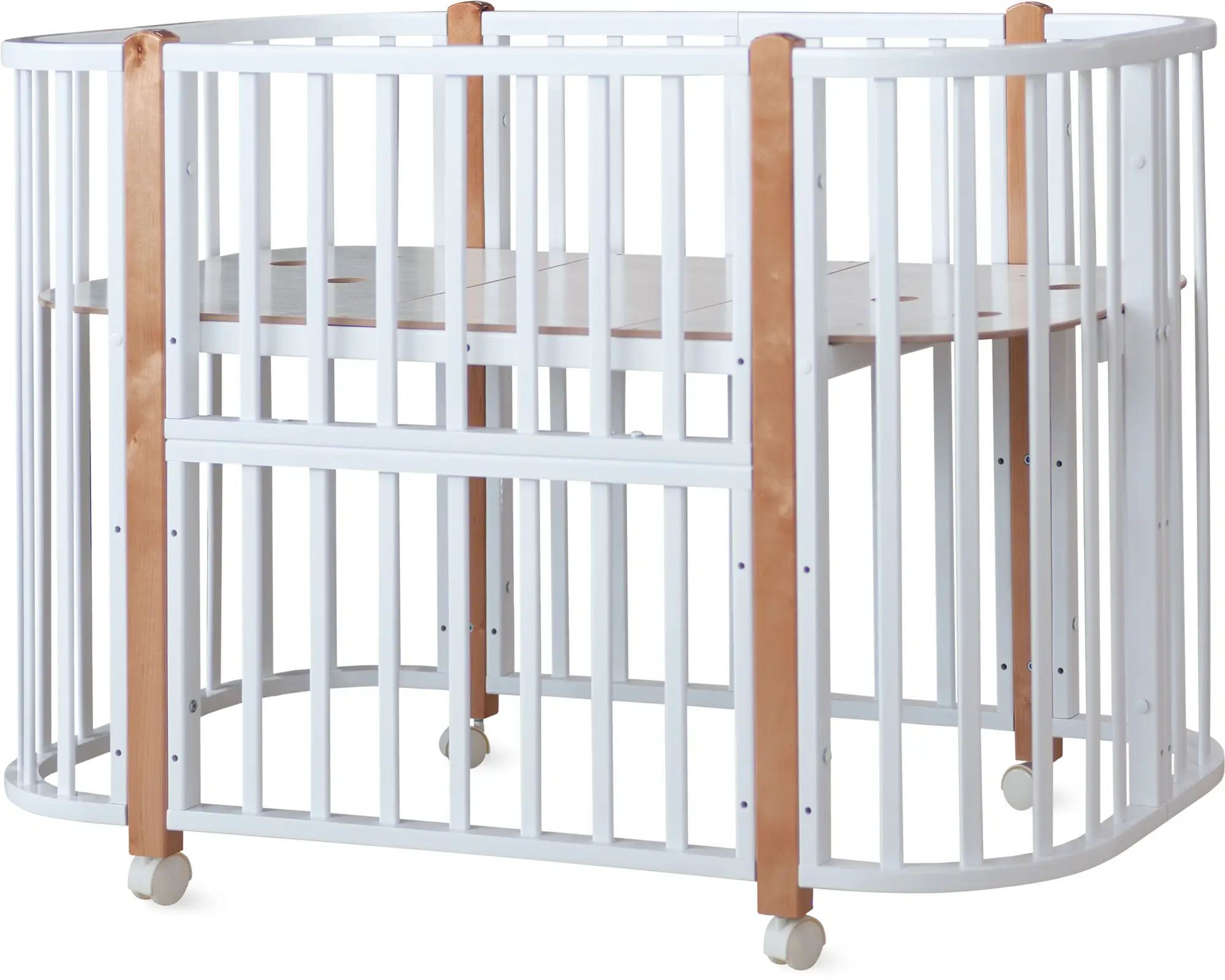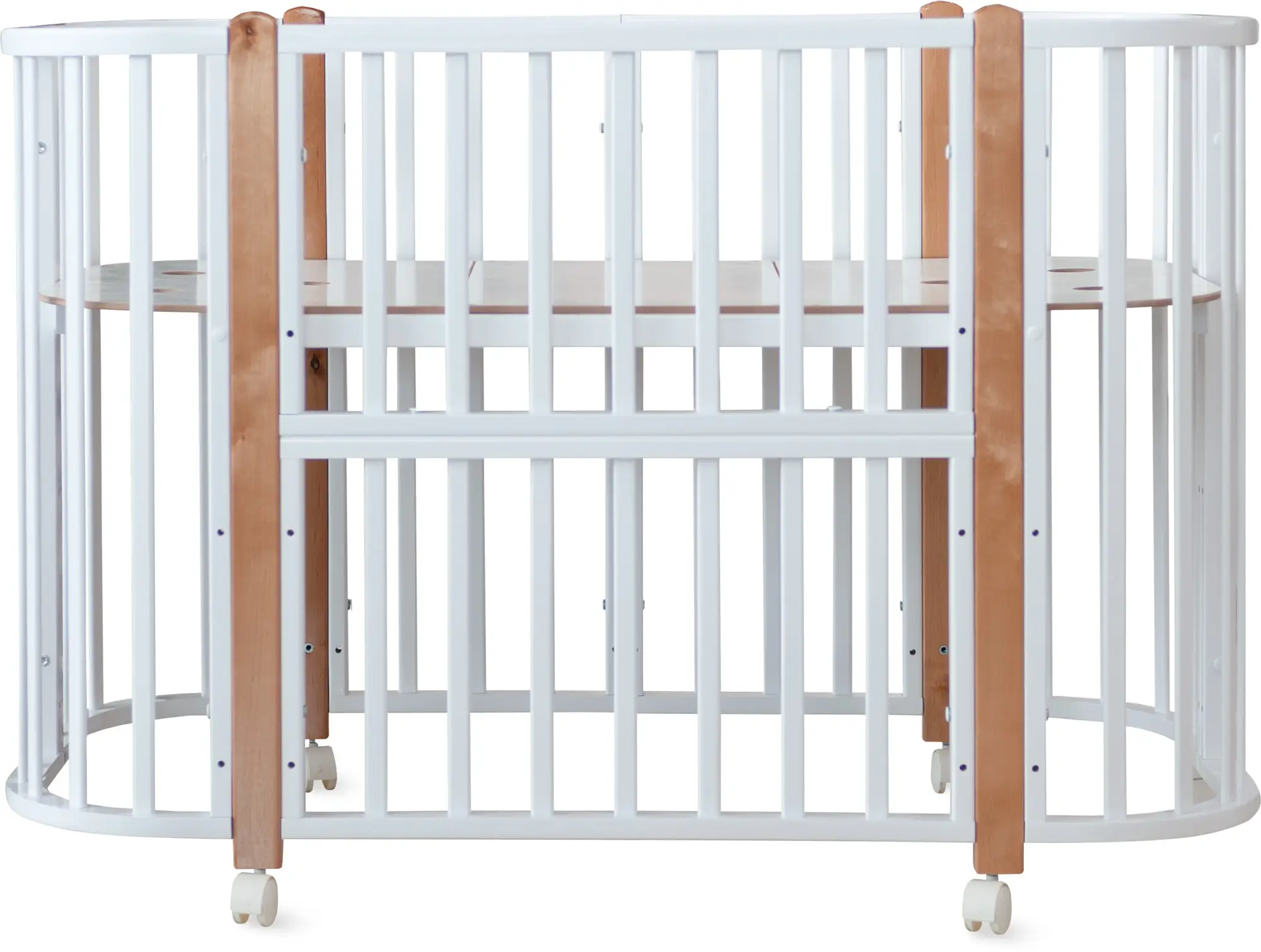 Благодаря современной форме – кроватка впишется в любой интерьер. По мере роста ребёнка кроватка трансформируется в манеж или диванчик для уже подросших детей. Высота кроватки регулируется за счёт установки колёс на стойки или на нижний радиус.