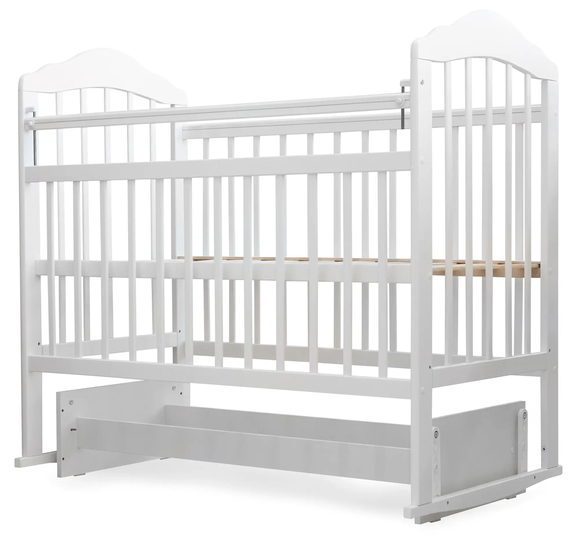 Прекрасно отшлифована и покрыта безопасными для ребёнка краской и лаком. Бортики оснащены силиконовыми накладками, чтобы защитить зубки малыша при прорезывании. Кроватка оснащена универсальным маятником. Но, если маятник не нужен, или ребёнок научился вставать в кроватке, то маятник можно легко заблокировать. Маятник поможет укачивать новорождённого в кроватке, а не на руках – это особенно актуально, если малышей двое, или ребёнок тяжёлый. Также маятник удобен когда ребёнок часто просыпается.