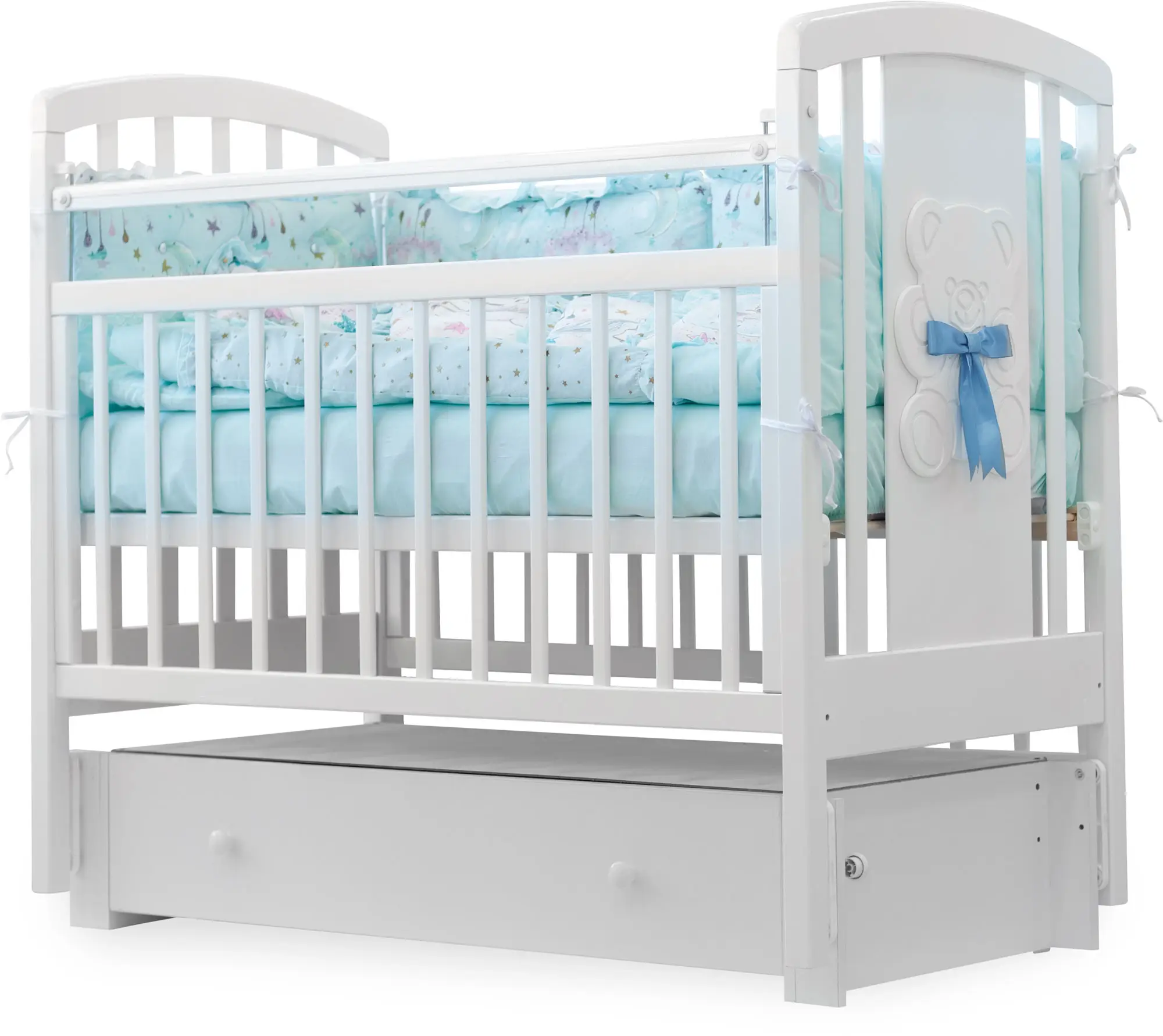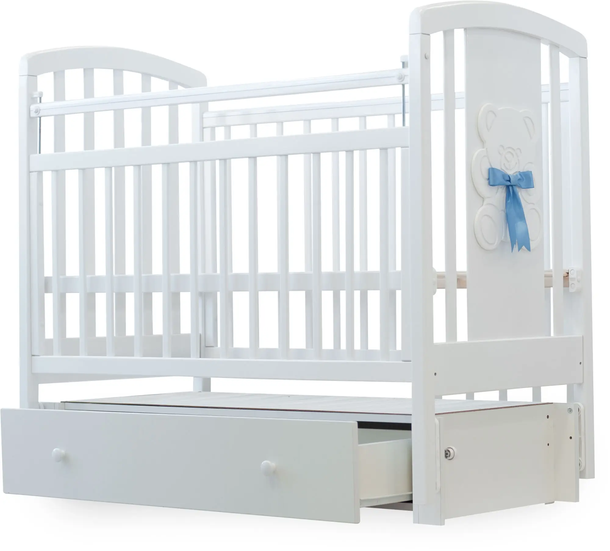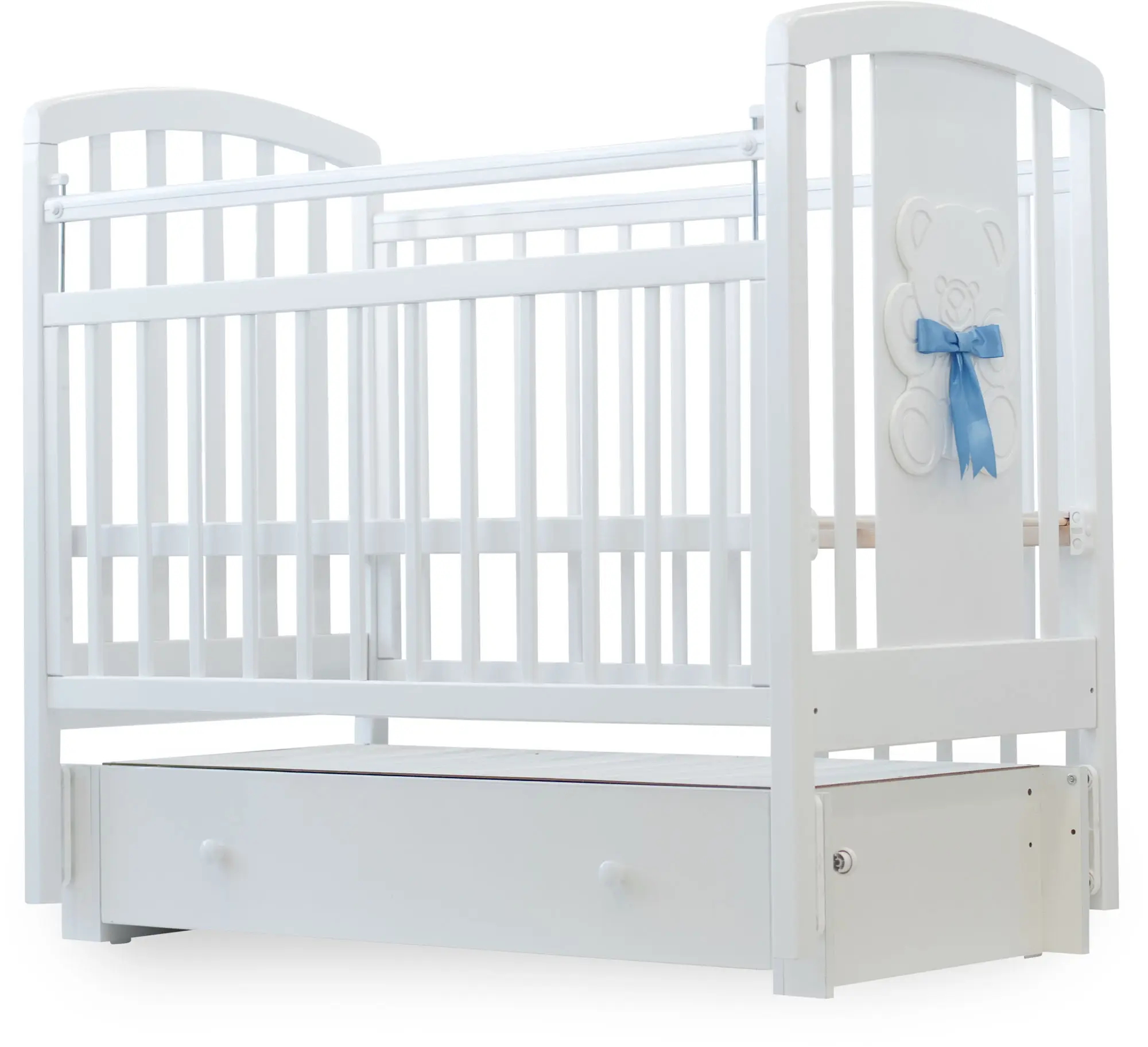 Элегантная, красивая и функциональная модель. Кроватку характеризует классический стиль и удобство в использовании. Одна из стенок кроватки декорирована милым мишкой с бантиком.