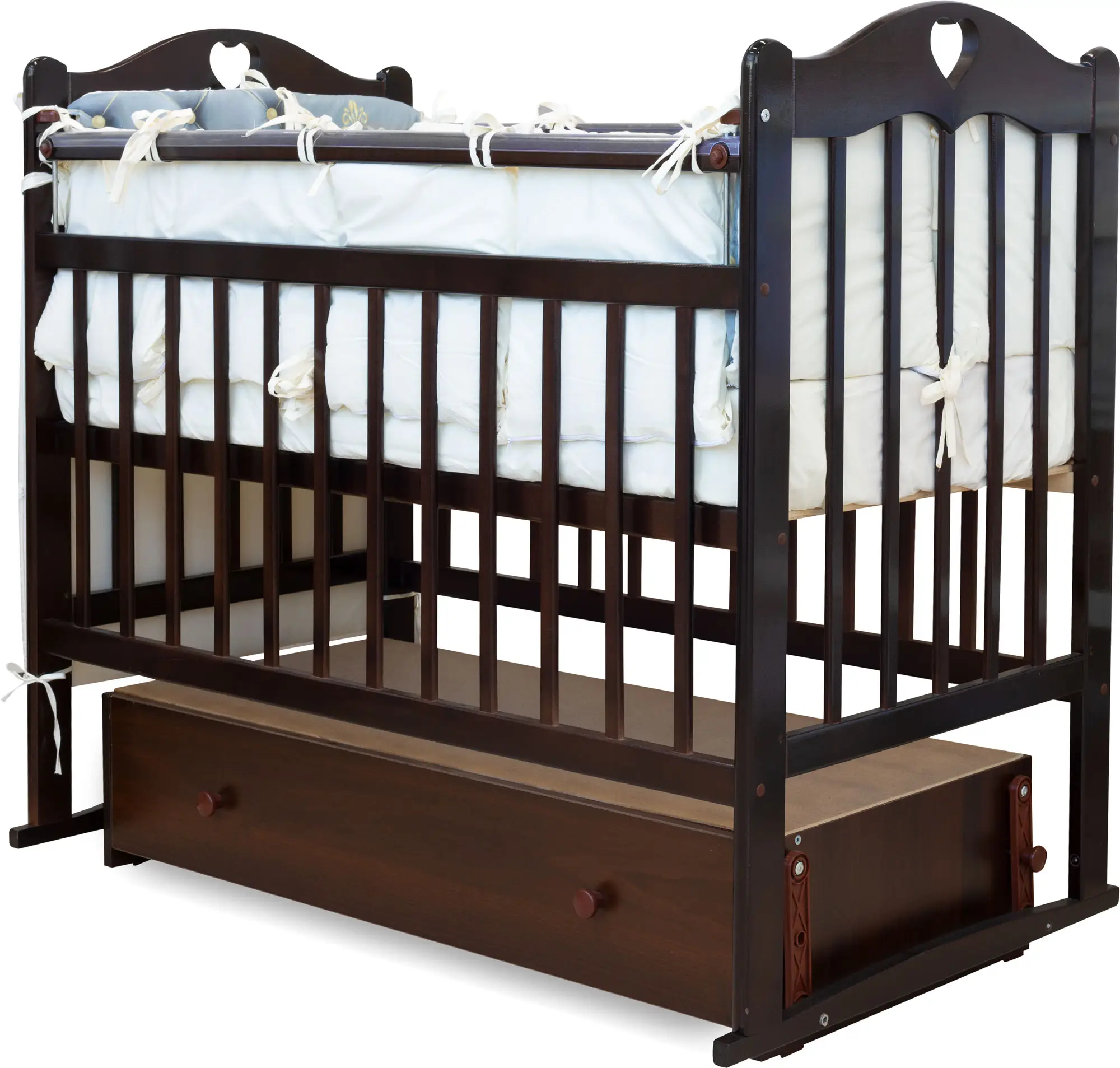 Кроватку характеризует классический стиль и инновационные возможности. Универсальный маятниковый механизм позволит очень нежно укачать малыша. Изделие выполнено из массива берёзы, покрытого гипоаллергенным лаком. Передняя стенка опускается, а для защиты детских зубок есть специальные силиконовые накладки. Ортопедическое днище регулируется по высоте в 2 положениях. Под ним расположен выдвигаемый ящик для хранения постельных принадлежностей.