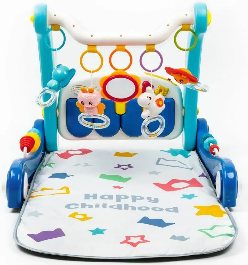 Игрушкой можно пользоваться с самого рождения. Пока малыш маленький, ее можно использовать, как коврик с подвесными игрушками. Когда малыш сможет сидеть, ему интересно будет играть с игровой панелью. Далее игрушку можно будет использовать, как каталка-ходунки.