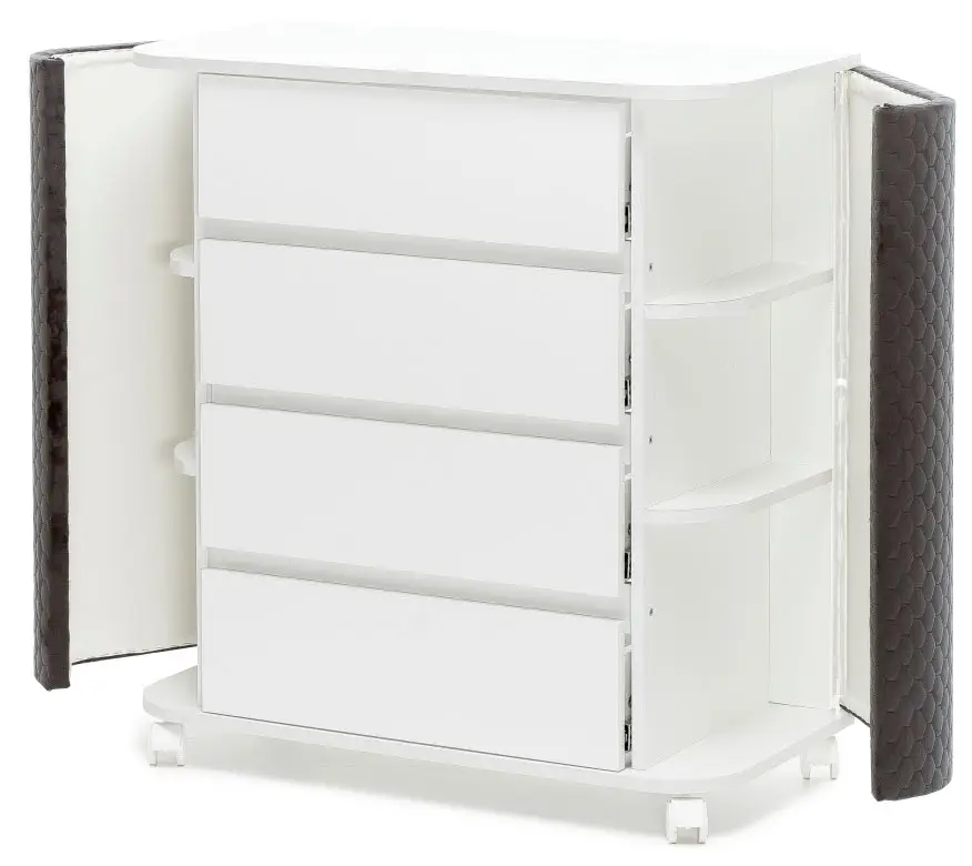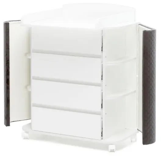 Отличительной чертой пеленального комода являются открывающиеся боковины с полками для различных мелочей. Открытие производится легким нажатием на боковину. Для удобства перемещения оснащен колёсами. Оборудован съемной пеленальной доской с защитными бортиками. Когда ребёнок вырастет из «пеленочного» возраста, пеленальный комод не потеряет своей актуальности среди мебели детской комнаты – он просто превратится в обычный комод для одежды и прочих вещей.