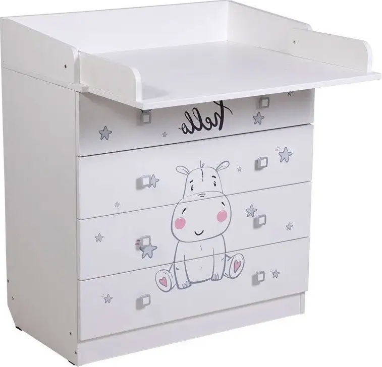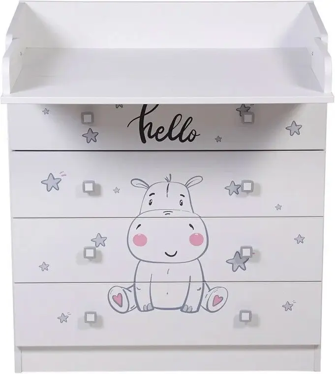 Комод Фея 1580 Бегемотик оснащён откидным пеленальным столиком, благодаря чему отлично подходит для смены подгузника, массажа или переодевания ребёнка. При откидывании пеленальной поверхности по всем сторонам образуются плавные защитные бортики.