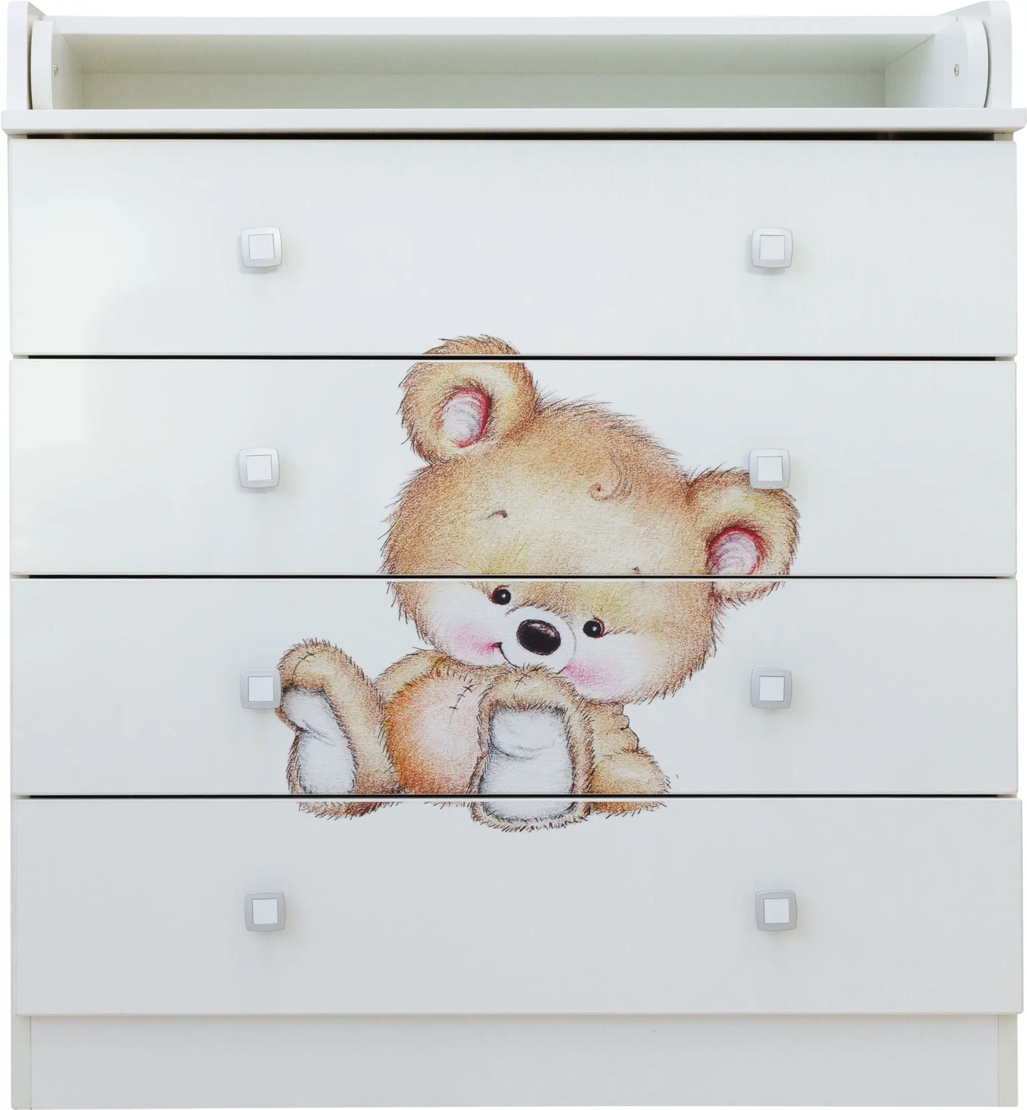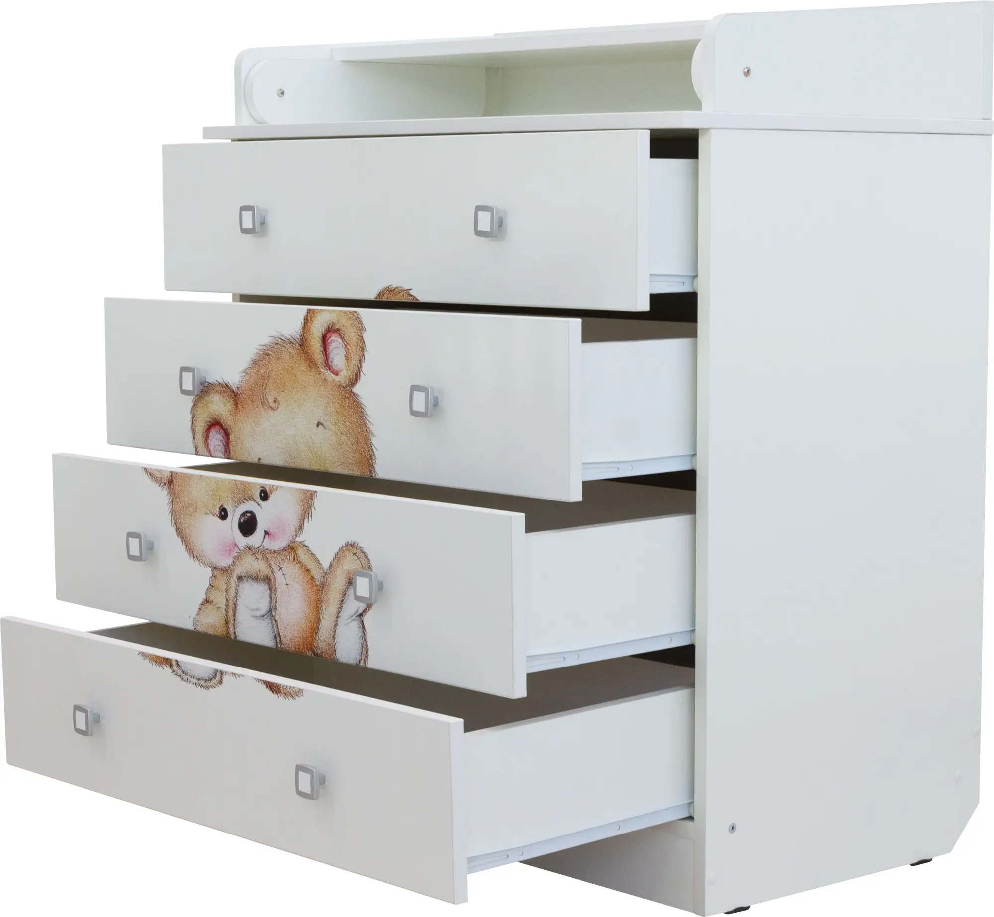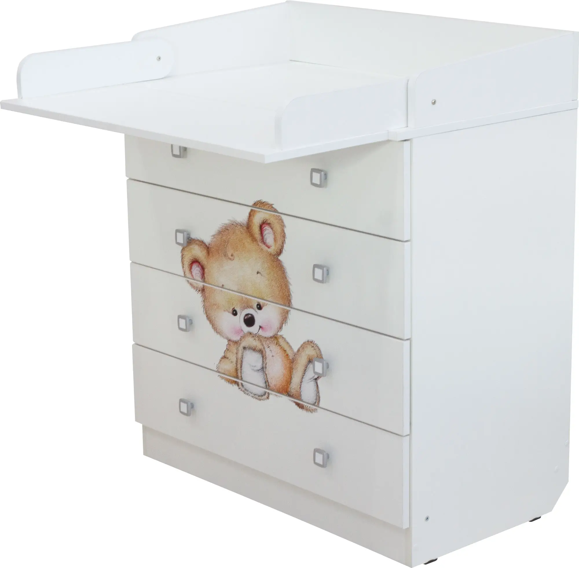 Модель максимально функциональна – совмещает в себе комод и пеленальный столик. В комоде удобно хранить все детские принадлежности – детские вещи, игрушки, постельное бельё, подгузники, крема, присыпки. Комод изготовлен только из натуральных и безопасных материалов. Нежный рисунок нанесён ультрафиолетовой печатью, с использованием безопасных и безвредных чернил. Весёлое изображение на фасадах заинтересует малыша и родителей.