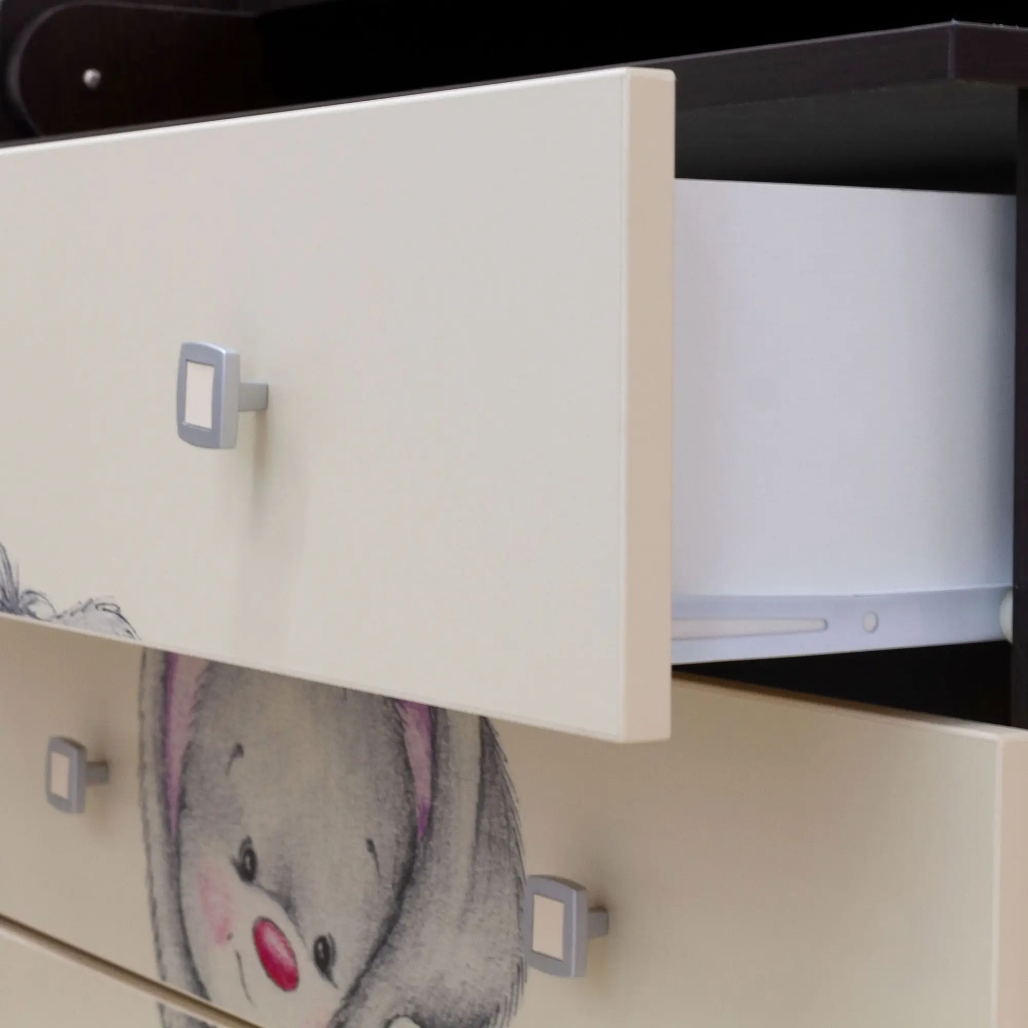 4 глубоких ящика для детских принадлежностей оснащены бесшумными и легко скользящими в металлических пазах благодаря роликовых направляющими.