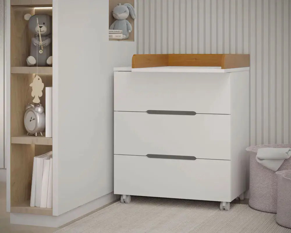 Комод Anniken Ecco – это практичное и универсальное решение для детской комнаты. Съемный пеленальный столик при необходимости можно убрать, а два колеса комода имеют стопоры, из-за чего нет никакого труда зафиксировать мебель в нужном месте.